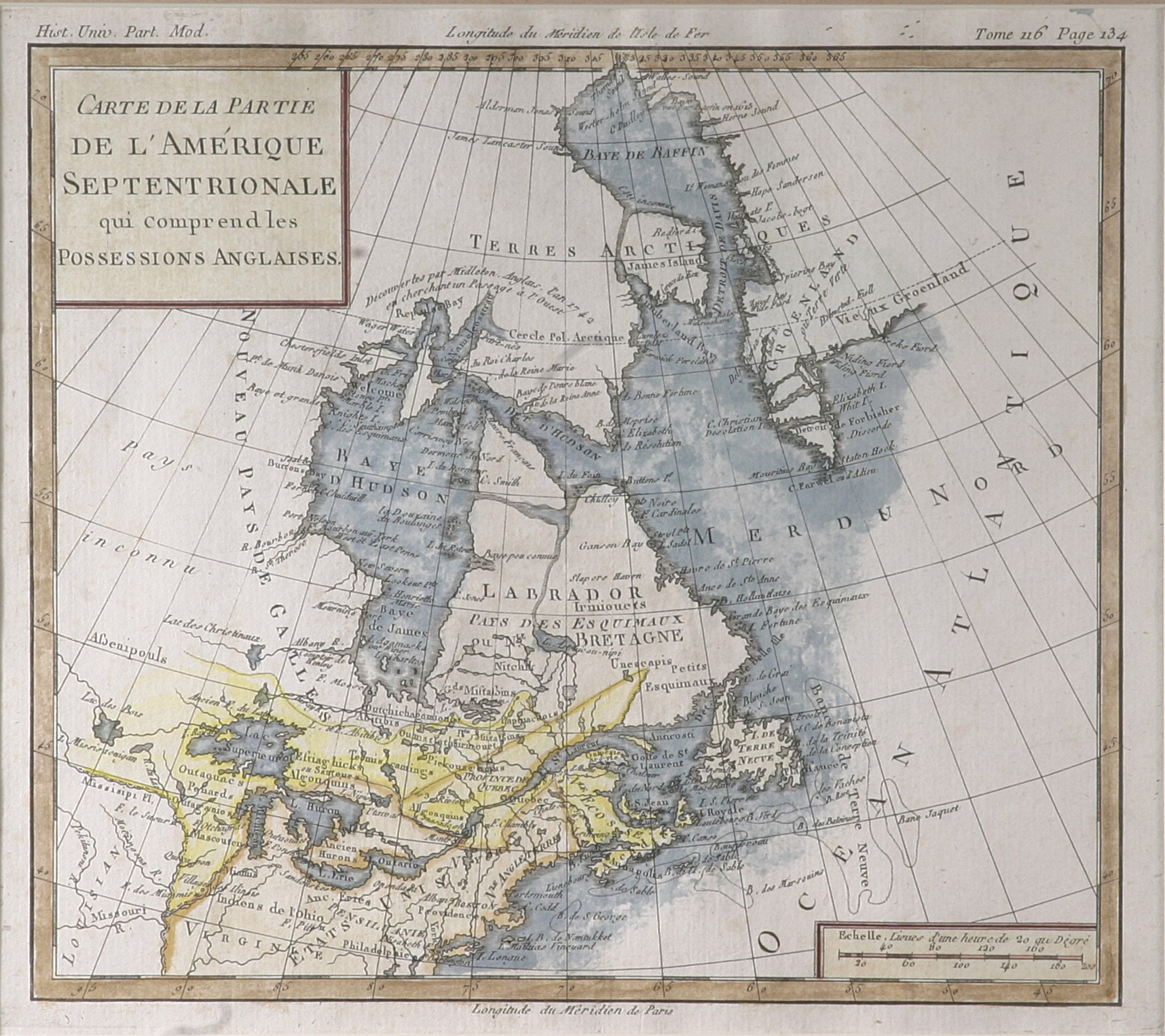 This map depicts colonial United States and Canada from Greenland and Baffin Bay to Philadelphia, the map extends west past Lake Superior to the Louisiana Territory. It is titled “Carte d'une Partie DE L'AMERIQUE SEPTRIONALE qui comprendles POSSESSIONA ANGLAISES” in the top left corner.