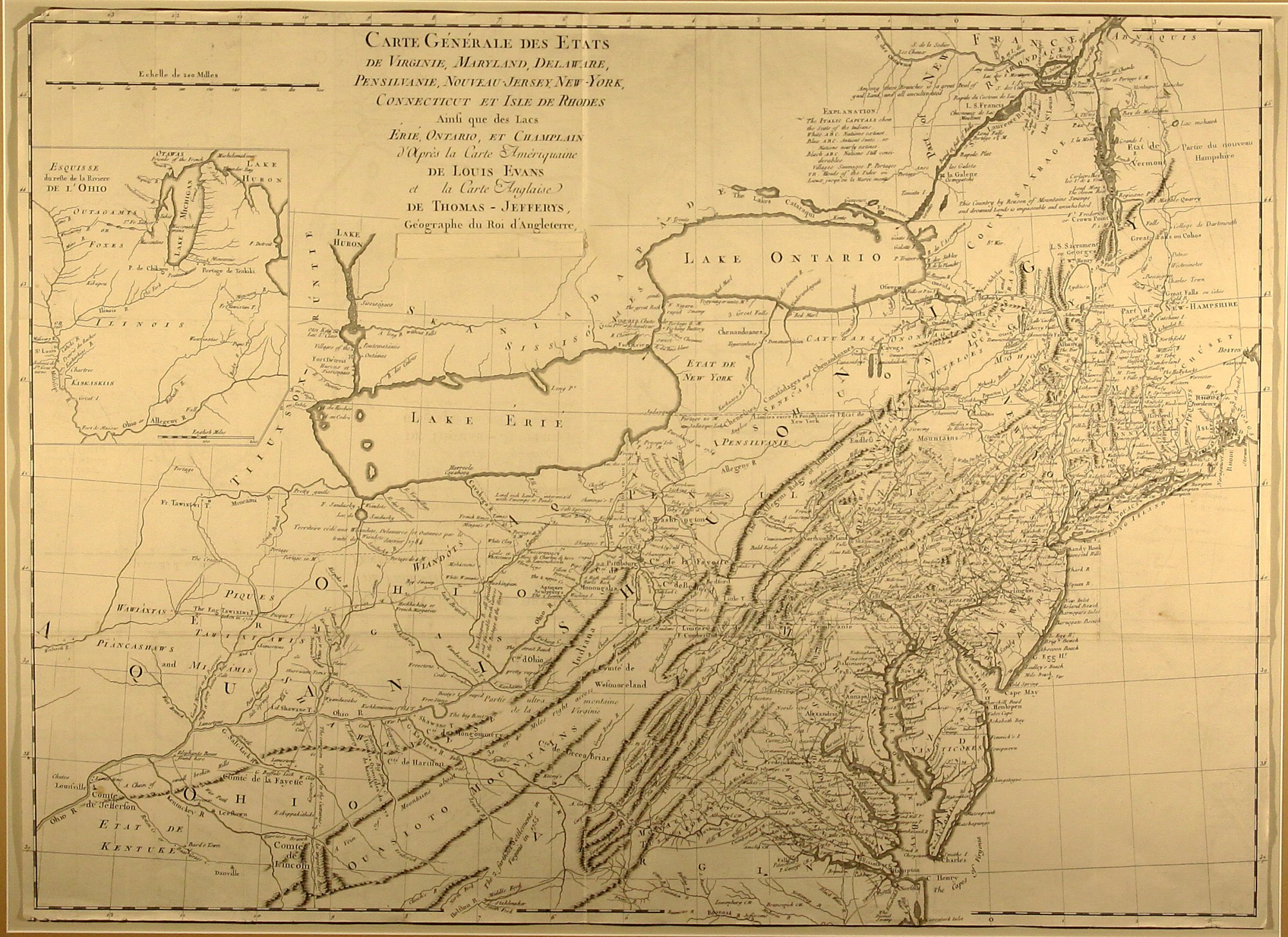 This map depicts the Great Lakes area, particularly around Lake Ontario and Lake Erie. It is titled “Carted Generale Ses Etats De Virginie, Maryland, Delaware, Pensilvanie, Nouveau-Jersey, New-York, Connecticut Et Isle de Rhodes Ainfi que des Lacs Erie, Ontario, Et Champlain D’Apres la Carte Ameriquaine De Louis Evans et la Carte Anglaise De Thomas-Jeffreys, Geopraphe du Roi d’Angleterre” at the top.