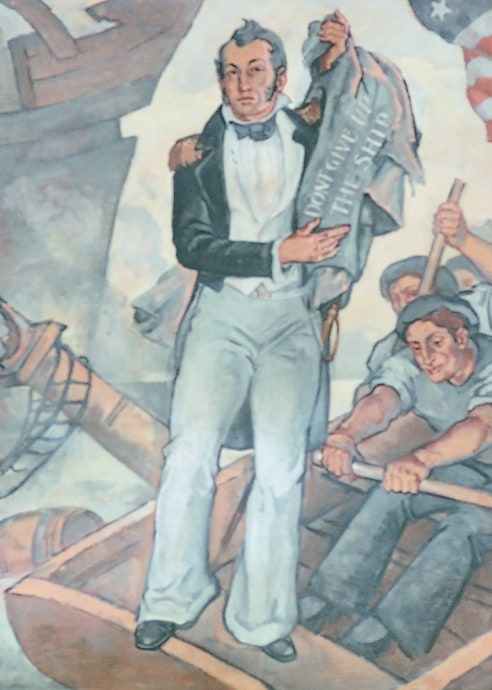 The eleventh panel shows Commodore Perry’s victory on Lake Erie in 1813. This panel depicts Oliver Hazard Perry’s victory over the British on Lake Erie, ensuring American control of the Great Lakes after the War of 1812.