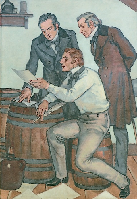 The seventh panel depicts Manasseh Cutler's plans to establish schools and churches in Ohio. Manasseh Cutler secured from the Confederation Congress the right to purchase up to 1.5 million acres in Marietta for roughly 8 cents an acre. Cutler and the first group of settlers to Ohio in April 1788 established the type of schools and churches usually associated with New England towns. In the scene depicted here, Cutler visits the settlement.
