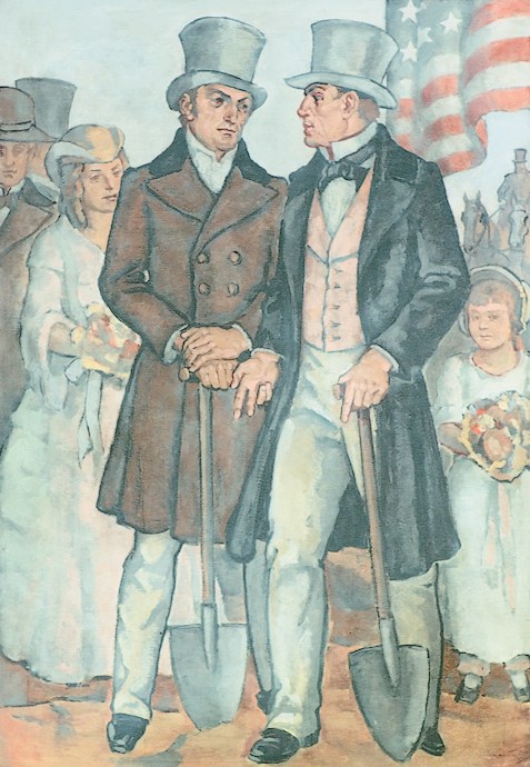 The thirteenth panel depicts the opening of the Ohio & Erie Canal in 1832. Construction on the 309-mile Ohio & Erie Canal, built to connect the Ohio River at Portsmouth and Lake Erie, began in 1825. The canal had to be at least 4-feet deep, 26- feet wide at the bottom and 40-feet wide at the top. Although it operated into the 1870s, most areas of the canal were not in use near the end because of the high costs of maintaining them. In 1913, a flood destroyed those parts of the canal still in use.