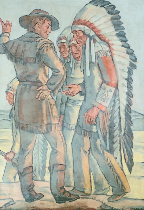 The sixth panel depicts the 1764 Treaty with Chief Pontiac. After waging a series of attacks against English settlements in the Ohio Country in 1763, Pontiac, chief of the Ottawa Indians, ended his rebellion in late 1764. He did not formally surrender to the English (the scene depicted here) until July 1766.