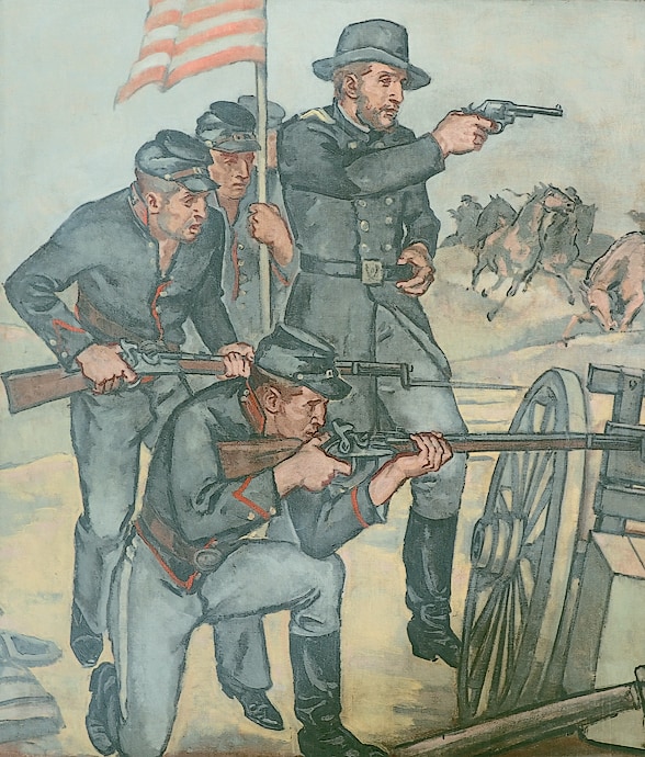 The fifteenth panel shows the 1863 defeat of the Confederate cavalry by General John Morgan at Buffington. This panel commemorates the only Civil War battle fought in Ohio. In 1863, Confederate cavalry commander John Hunt Morgan led a group of about 2,500 Confederate soldiers from Kentucky into Indiana and then Ohio, pillaging towns and villages along the way. The federal army pursued them across southern Ohio, and eventually caught up with them at Buffington Island in Meigs County. About 700 of Morgan’s men were captured, but Morgan and the rest escaped and headed north. They made their way up to West Point near East Liverpool, where Morgan was finally forced to surrender.