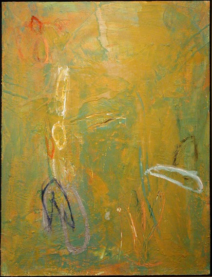 An abstract horizontal painting. The background is yellow and green with various markings in red, white, and black along the front.