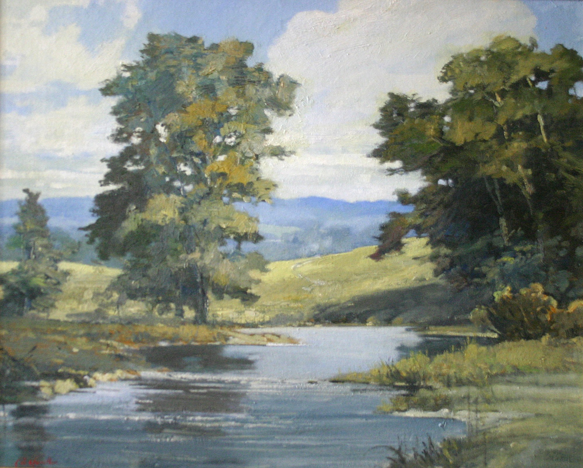 A vertical oil painting depicting a calm landscape scene. The painting depicts a river with a shore on both the left and right sides. Both shores have a patch of large trees and some small foliage. Hills or a mountain are visible in the background. The sky is a light blue with a few large, fluffy clouds.