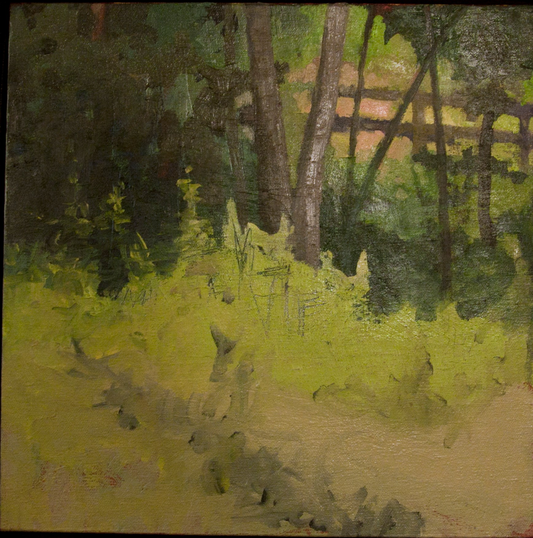 A square oil painting depicting a patch of greenery. There is a large patch of grass in the foreground depicted through thick strokes of light green. The trees in the background are painted with a darker green and there is a wood fence to the right.