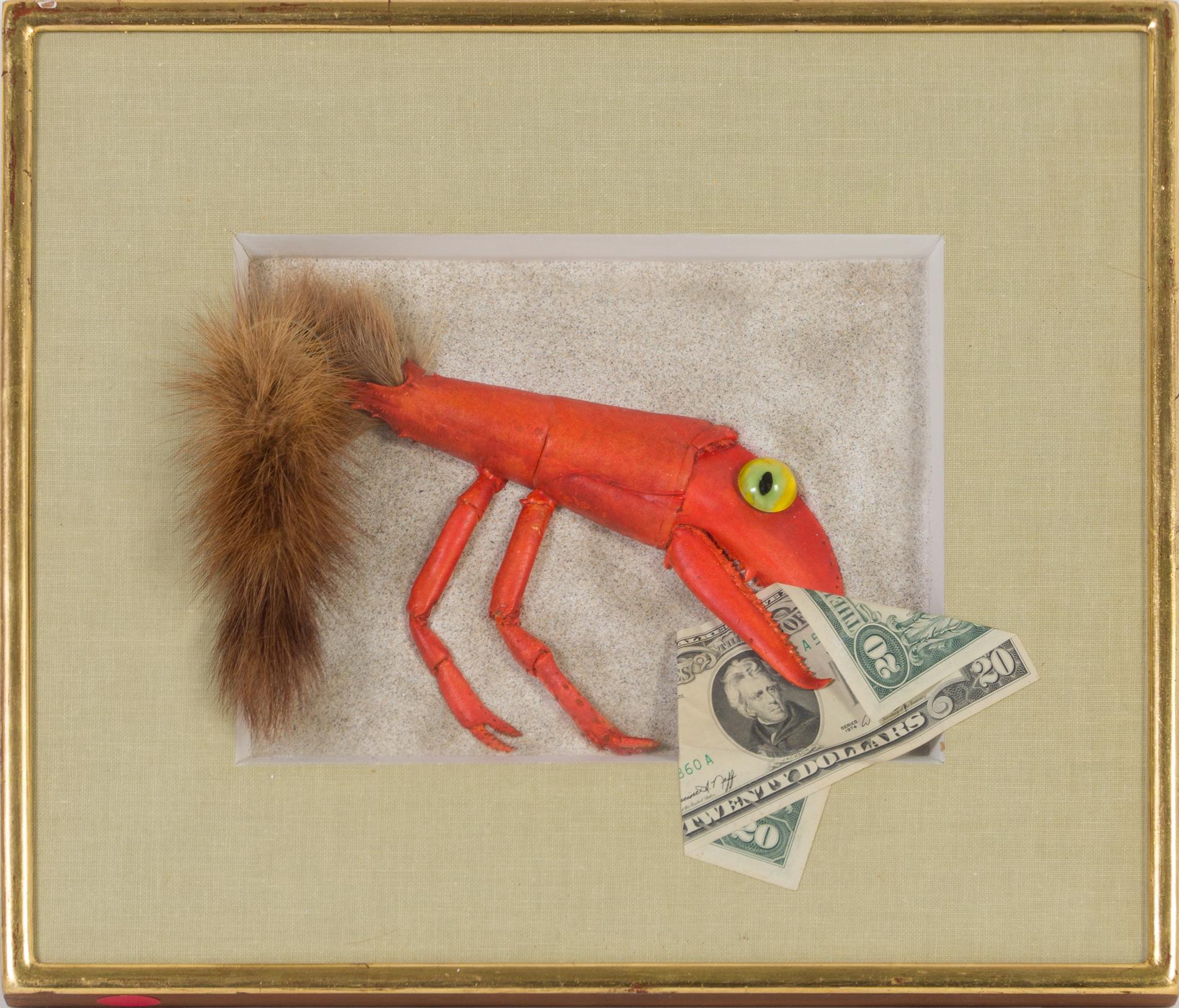 Lobster Shell, Fur, Twenty Dollar Bill, Cast Stone on Masonite