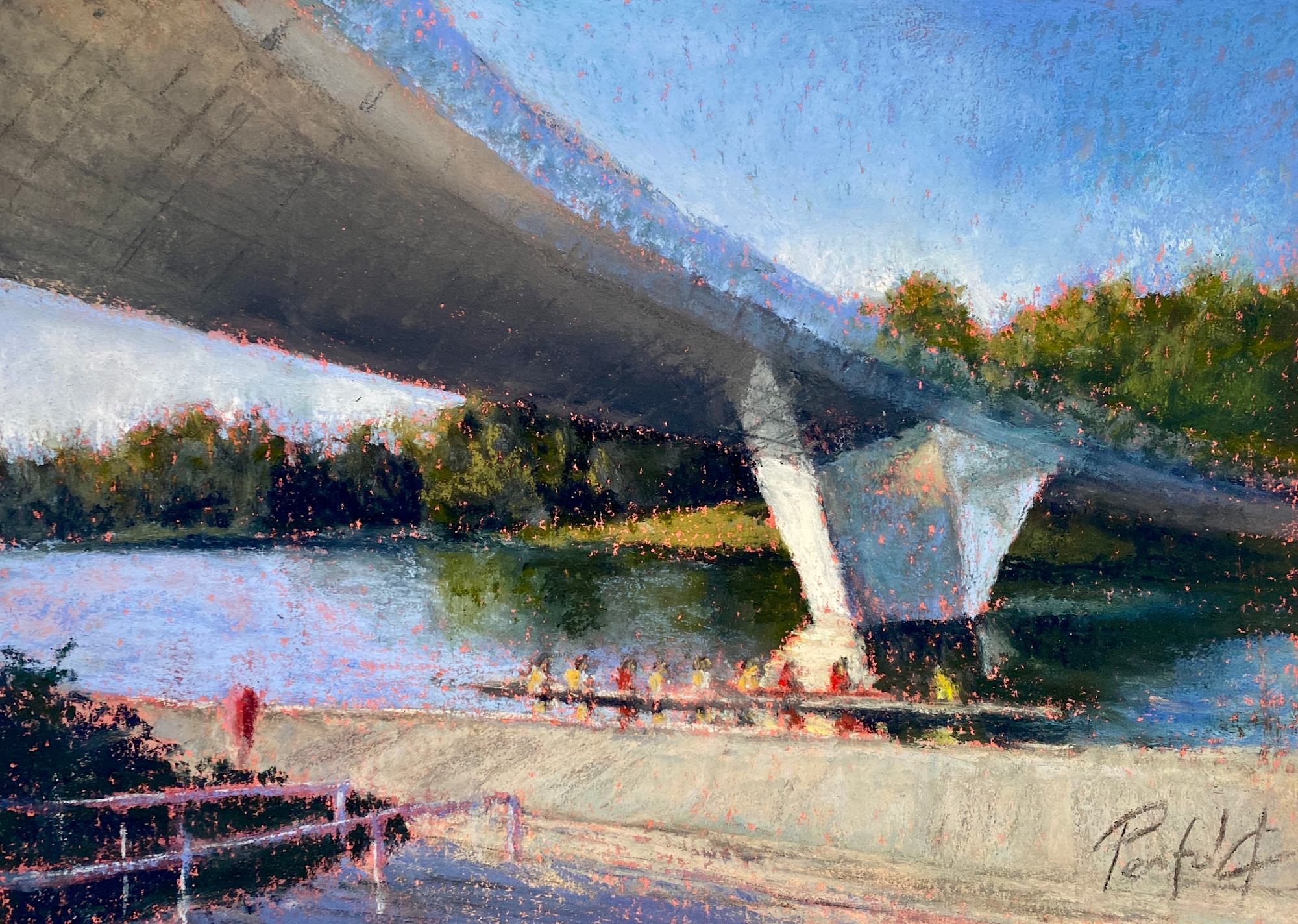 This painting depicts rowers underneath Adelaide Pedestrian Bridge. The bridge is not only designed to connect adjacent land but also to connect people to the land and each other. A cultural consultant was engaged to provide meaningful connection to country - during the day the bridge’s steel shows subtle traces of Australian animals etched into the surface and at night it shows representations of the southern constellations.
