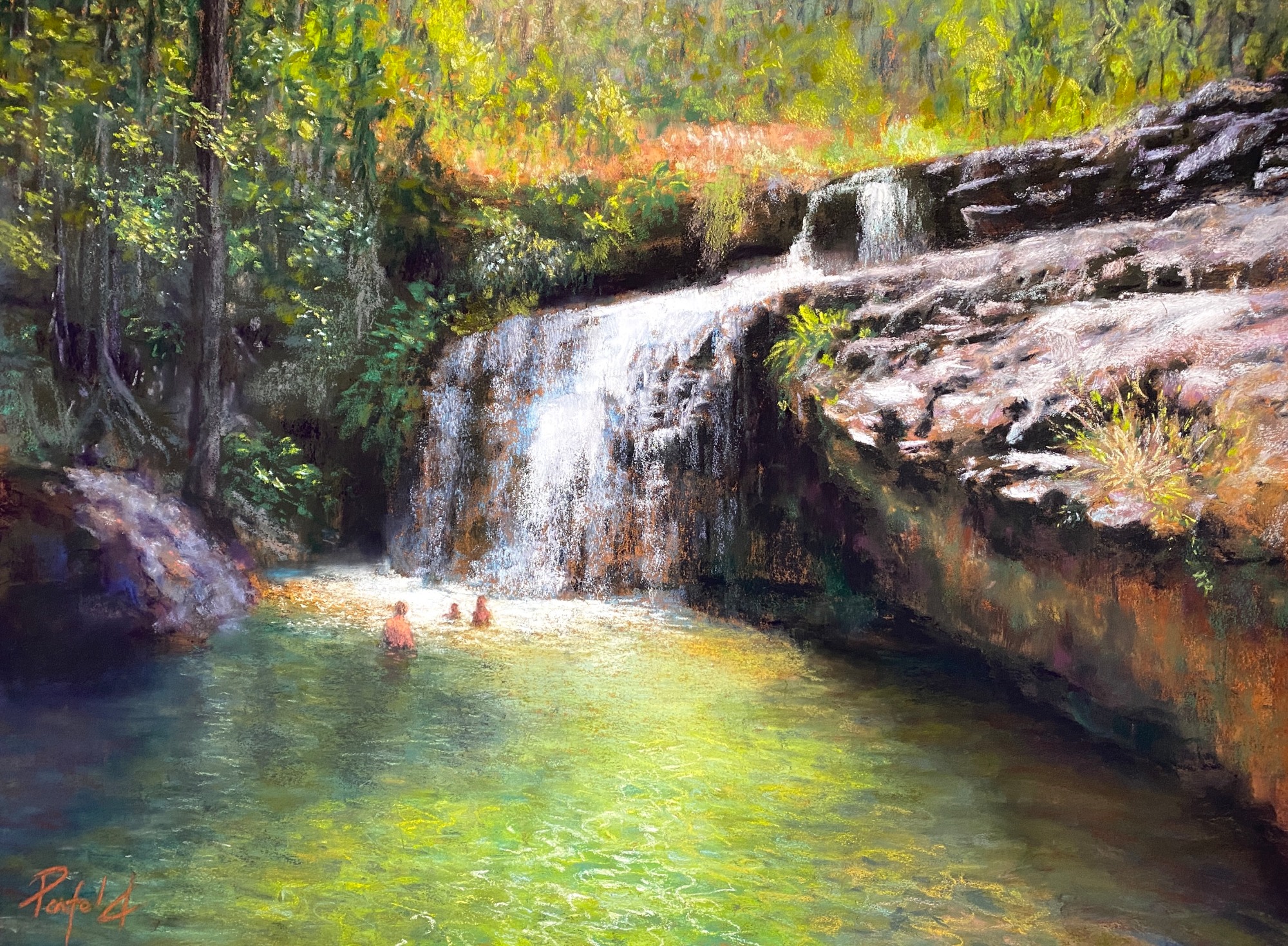 At midday, swimmers bask in the crystal-clear waters of Curtain Falls, laughter echoing through the pristine wilderness. Sunlight dances on the cascading water, creating a serene paradise. This natural wonder must be protected—respect its beauty, leave no trace, and preserve its magic for future generations.