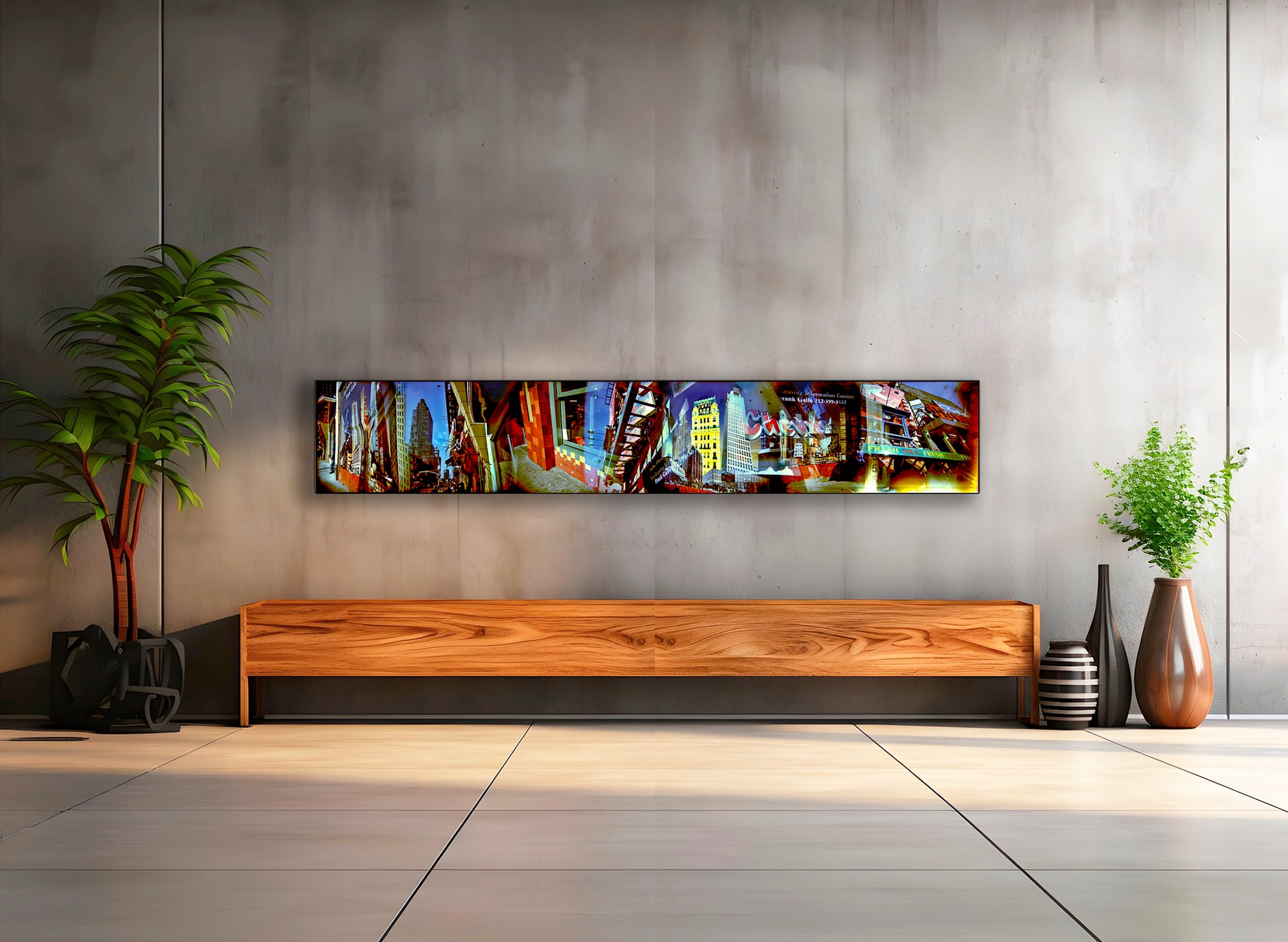 A layered urban composition of 42nd Street in Times Square, blending real buildings, signage, and reflections into a dynamic cityscape with cubist abstraction.