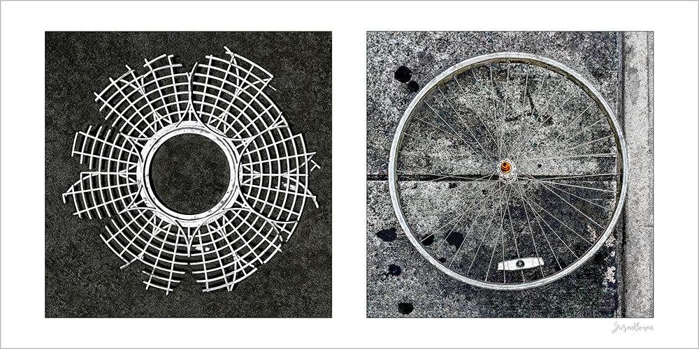 A diptych of fractured radial structures, a wire mesh form and a weathered bicycle wheel...exploring balance, fragmentation, and urban remnants.