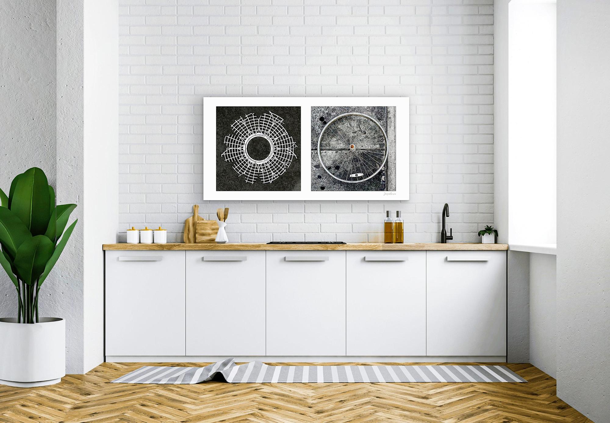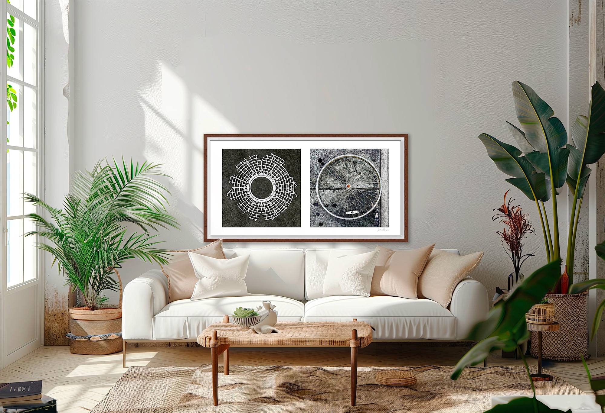 A diptych of fractured radial structures, a wire mesh form and a weathered bicycle wheel...exploring balance, fragmentation, and urban remnants.