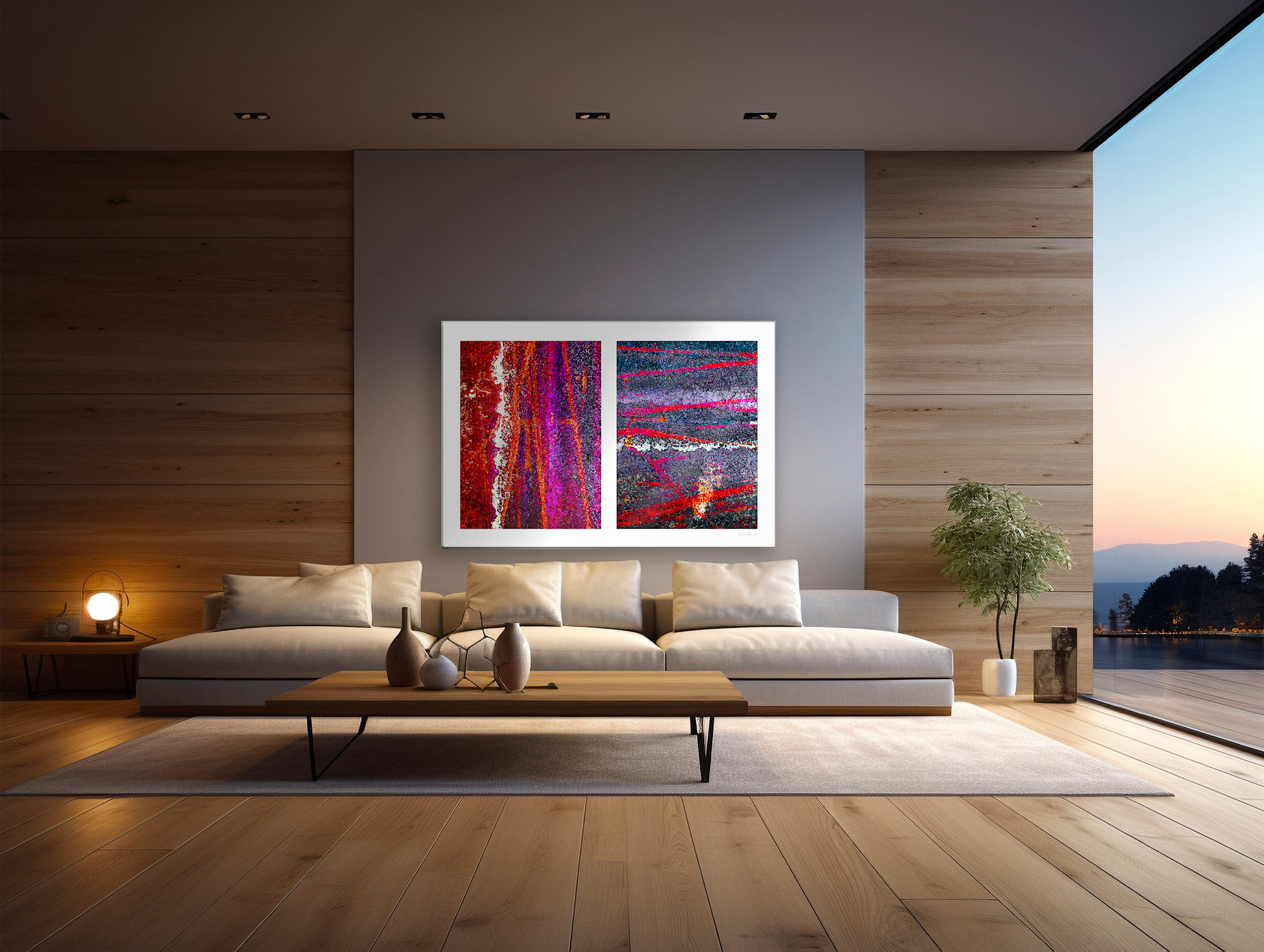 A richly textured diptych layering deep reds, oranges, and purples with fine crackling lines and worn asphalt patterns. Marks made are bicycle tracks through paint.