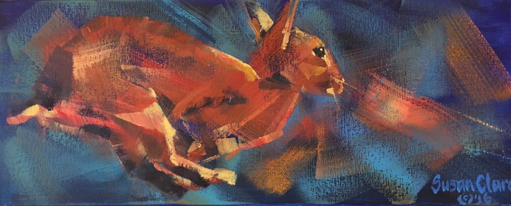 A sense of movement is captured by the use of gestural strokes and blocky colour in this contemporary wildlife painting of a running hare.