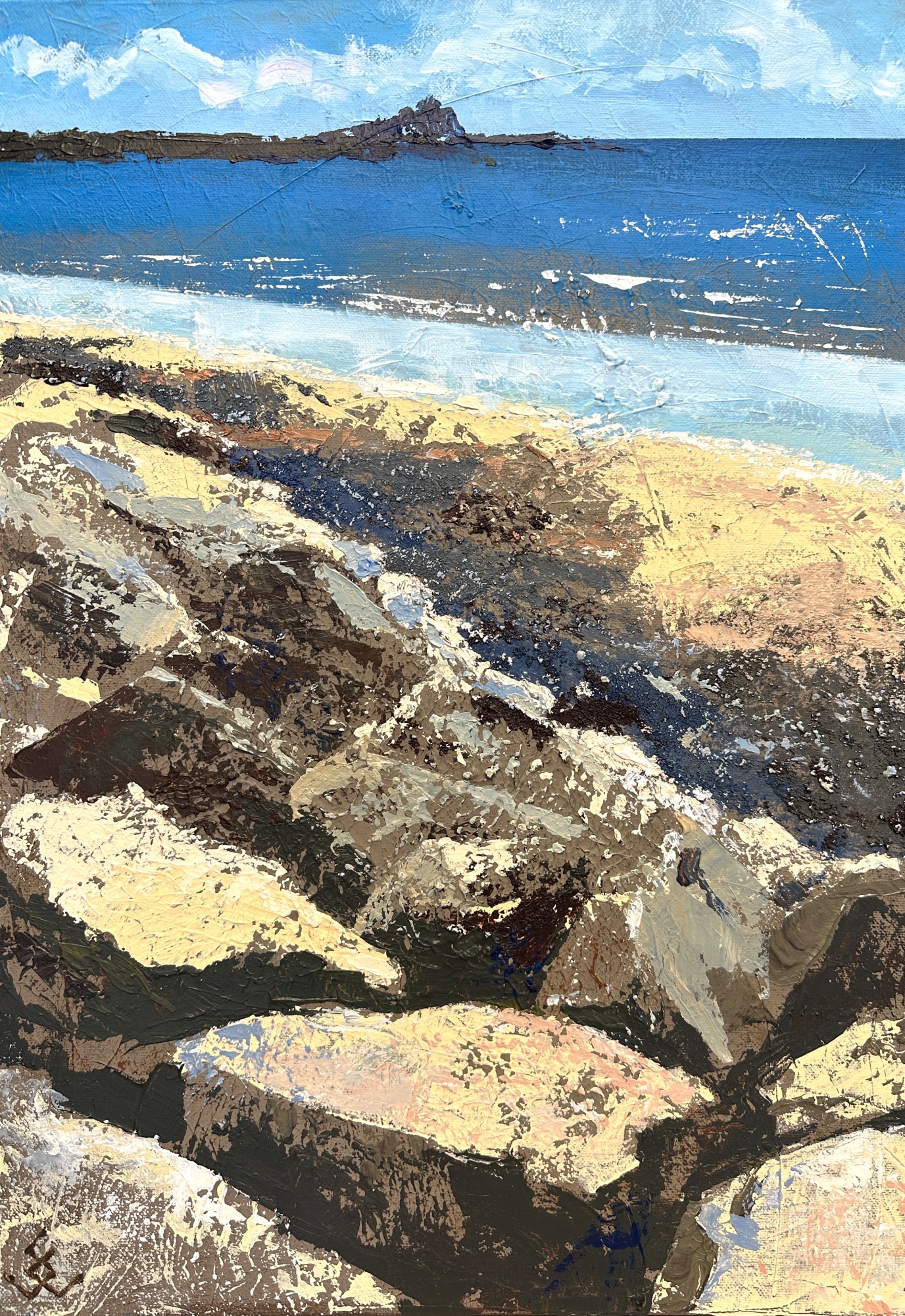 I loved adding texture into this seascape to convey the solidity and sheer scale of the boulders along the coast, walking to Marazion on the Cornish coast. St Michael's Mount is visible in the distance, but it's all about the rocks!
