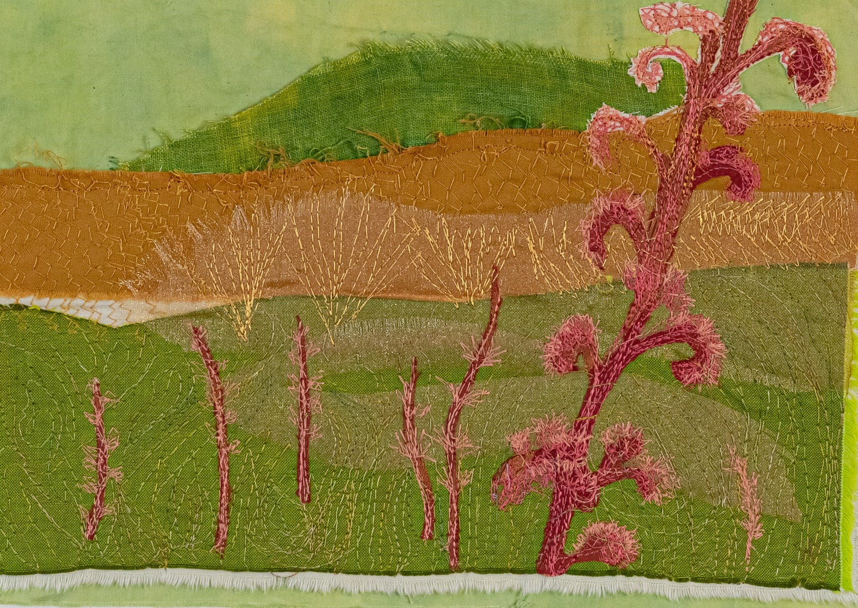 Textile applique using cotton and silk fabrics incorporating some naturally dyed fabric and free motion machine embroidery. Framed in of white mount, hand painted frame in Farrow & Ball ‘Pointing’, High quality anti- glare / 70%UV protective glass.