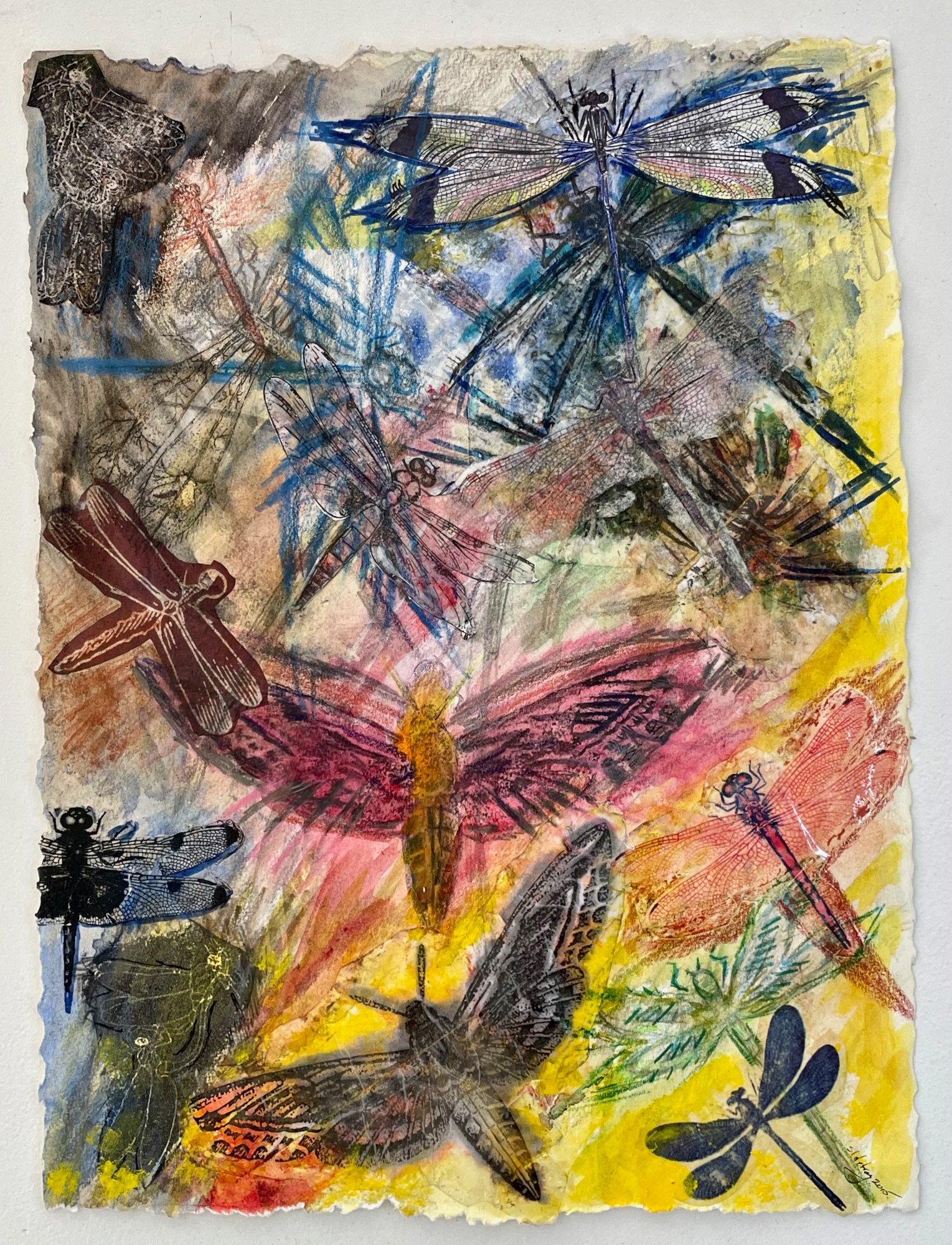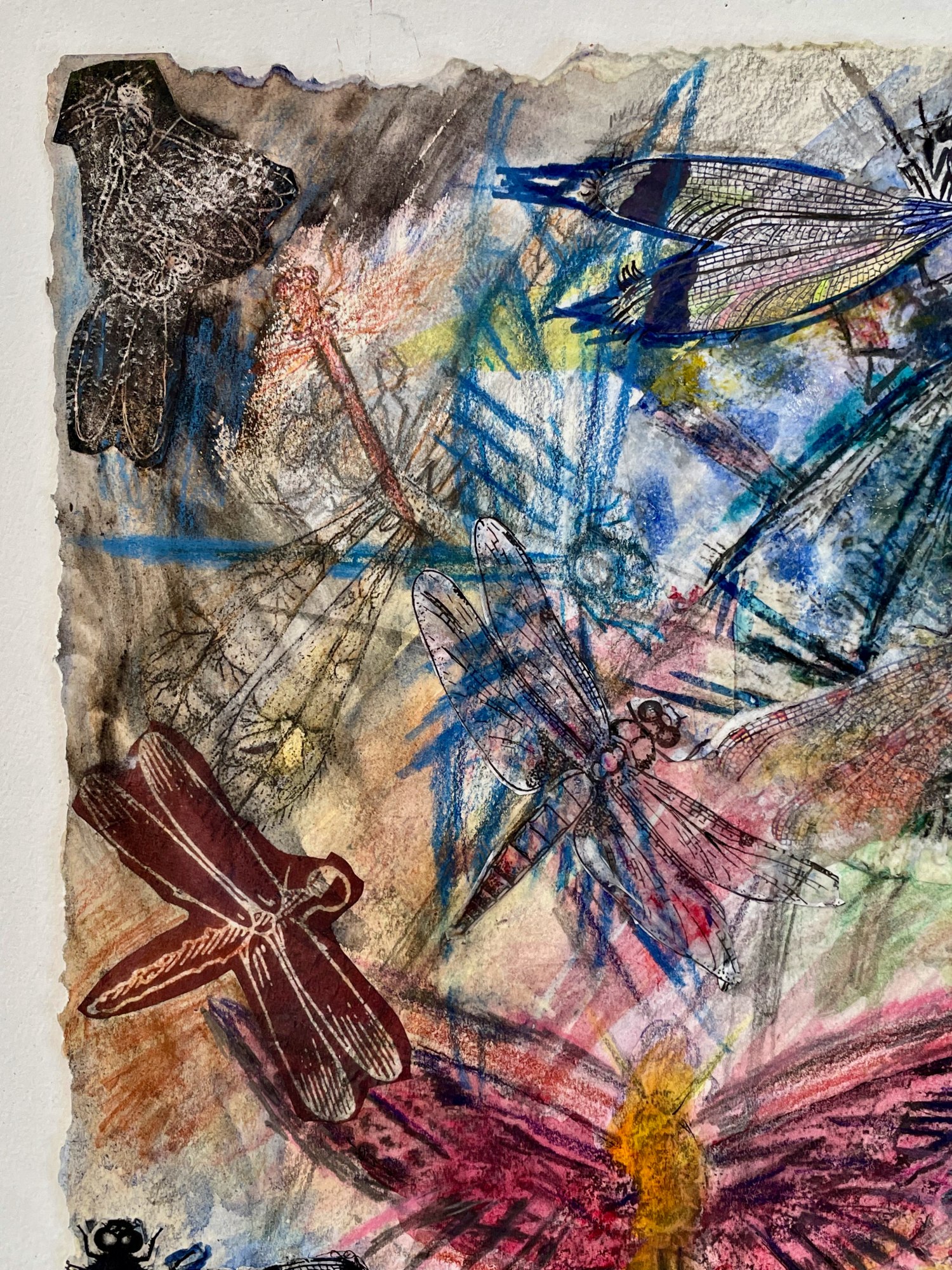 A deeply multi-layered dragonfly themed piece, created with liquid and media based transfers as well as pen, pencil and watercolor. This is a uniquely one of a kind artwork created in worship of the place insects have in our earthly existence.