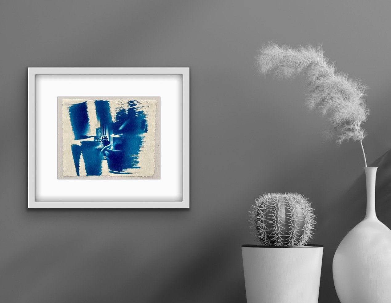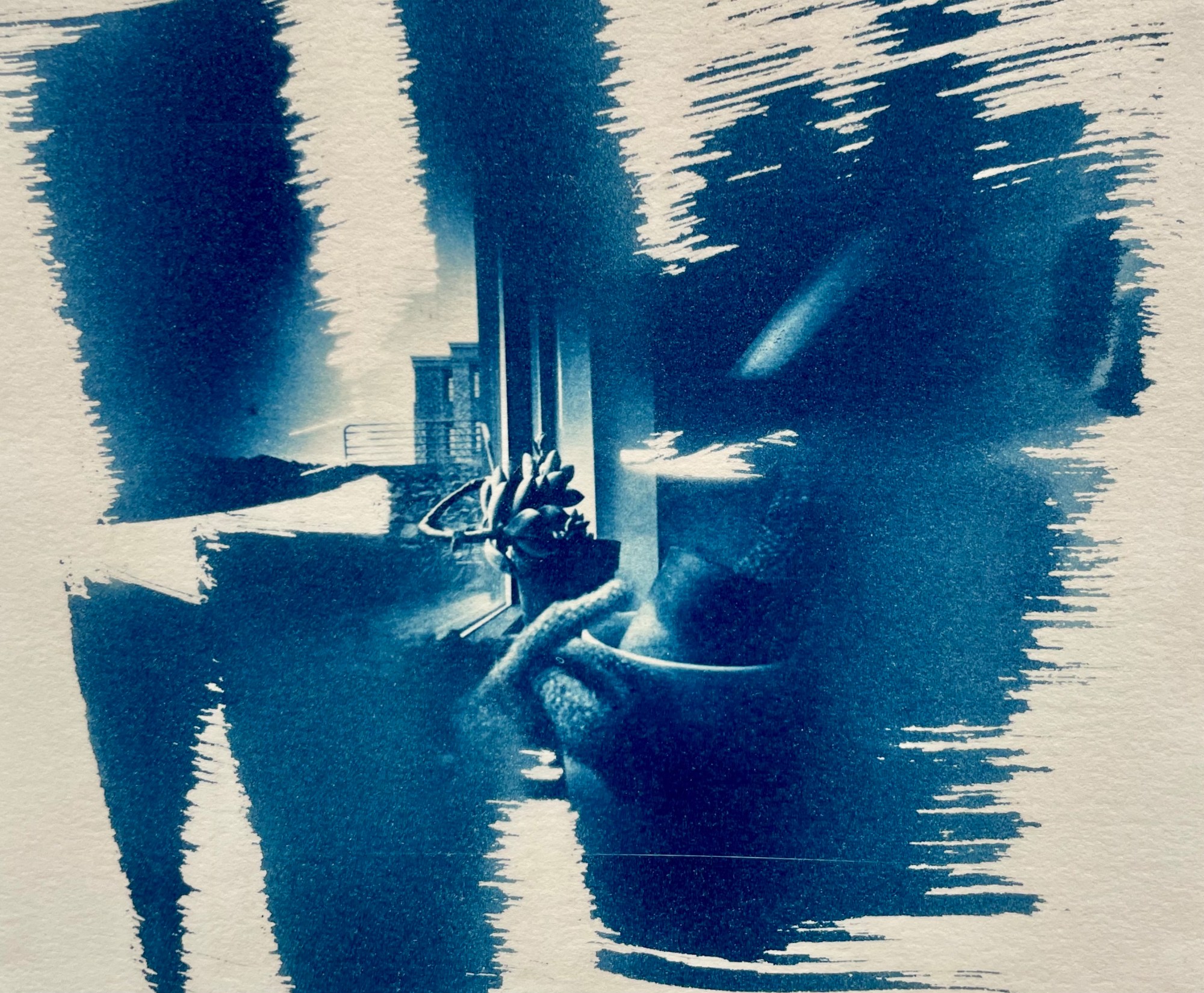 "Blue Window Cactus #6" is part of my Worship of Precious series, exploring my love of plants and insects. Using historic Cyanotype printing this small jewel takes a special place in the collection. Produced with a hand made pinhole camera the lens effect adds a fun and unique perspective. With a passion for botanical study, I bring my love of nature's forms to creating. Cactus hold a particular interest in their diversity and unusual shapes and sizes. This series of window cactus are created using contact negatives and historic cyanotype photo process. I am returning to using analog methods I began in the 90's, including cyanotypes on art paper with deckled edges.This piece and others were created during my employment as a photographic support staff in a science bio optics lab. Housed in a basement I appreciated the sunken windows at the back of the lab.