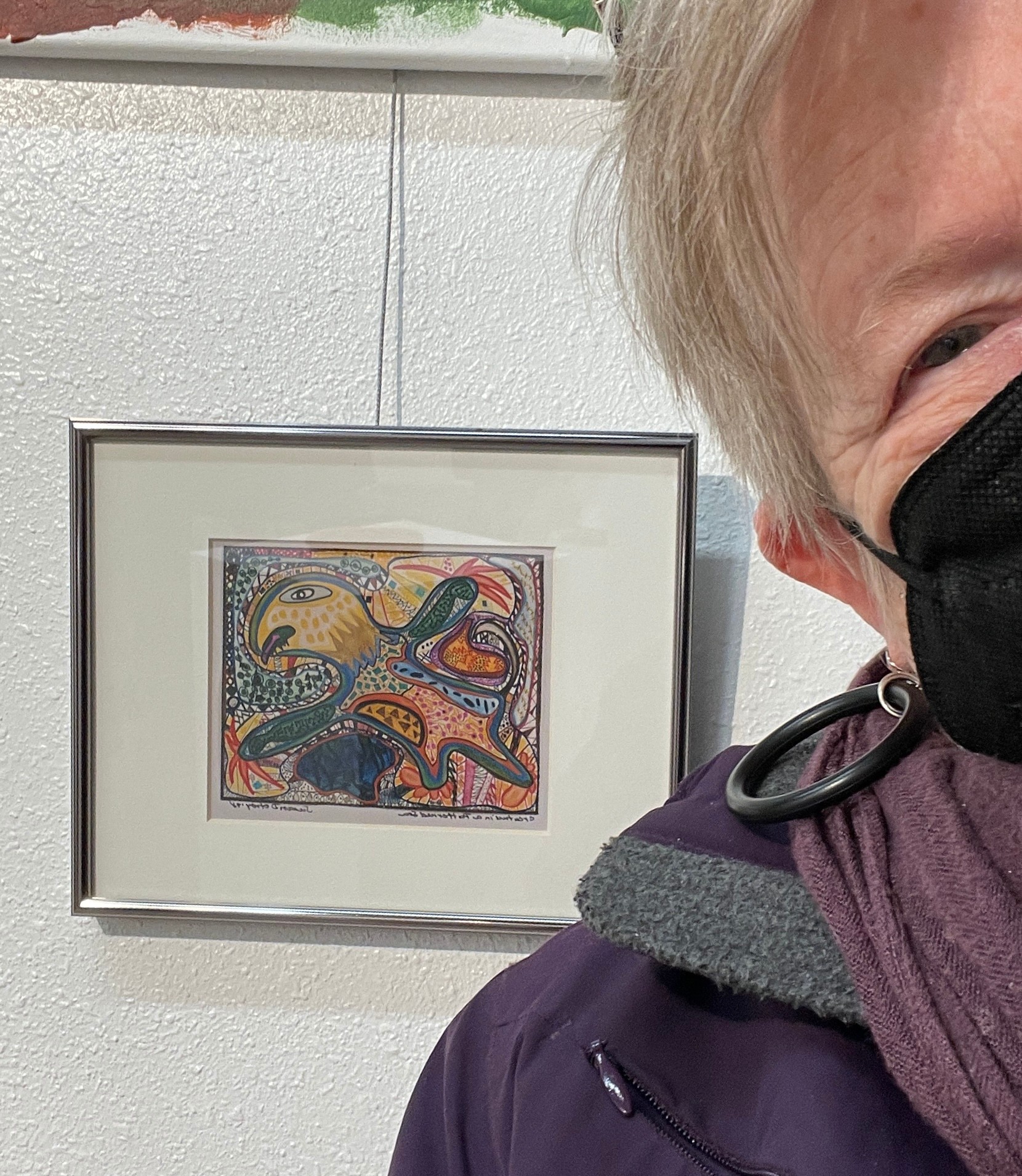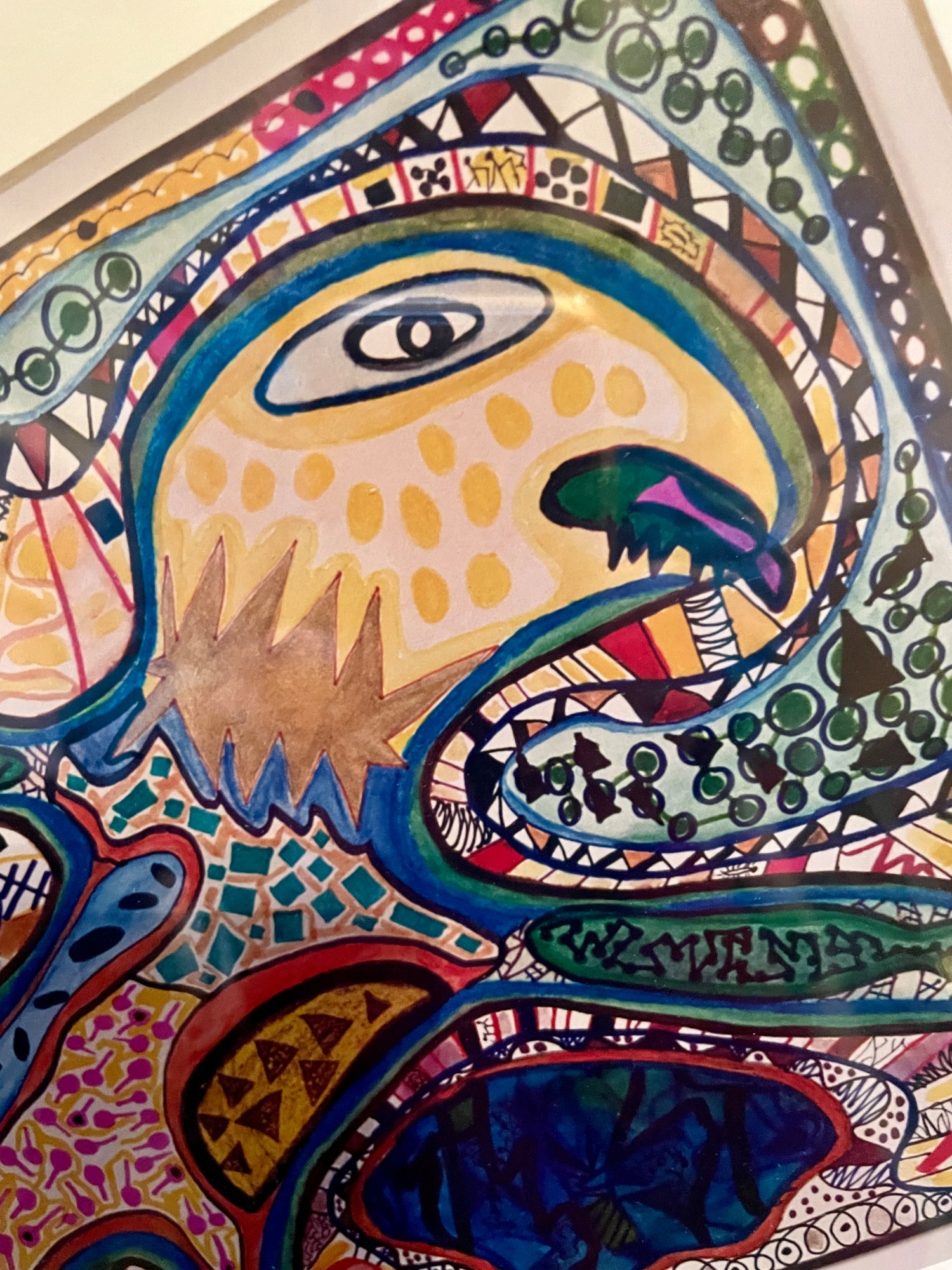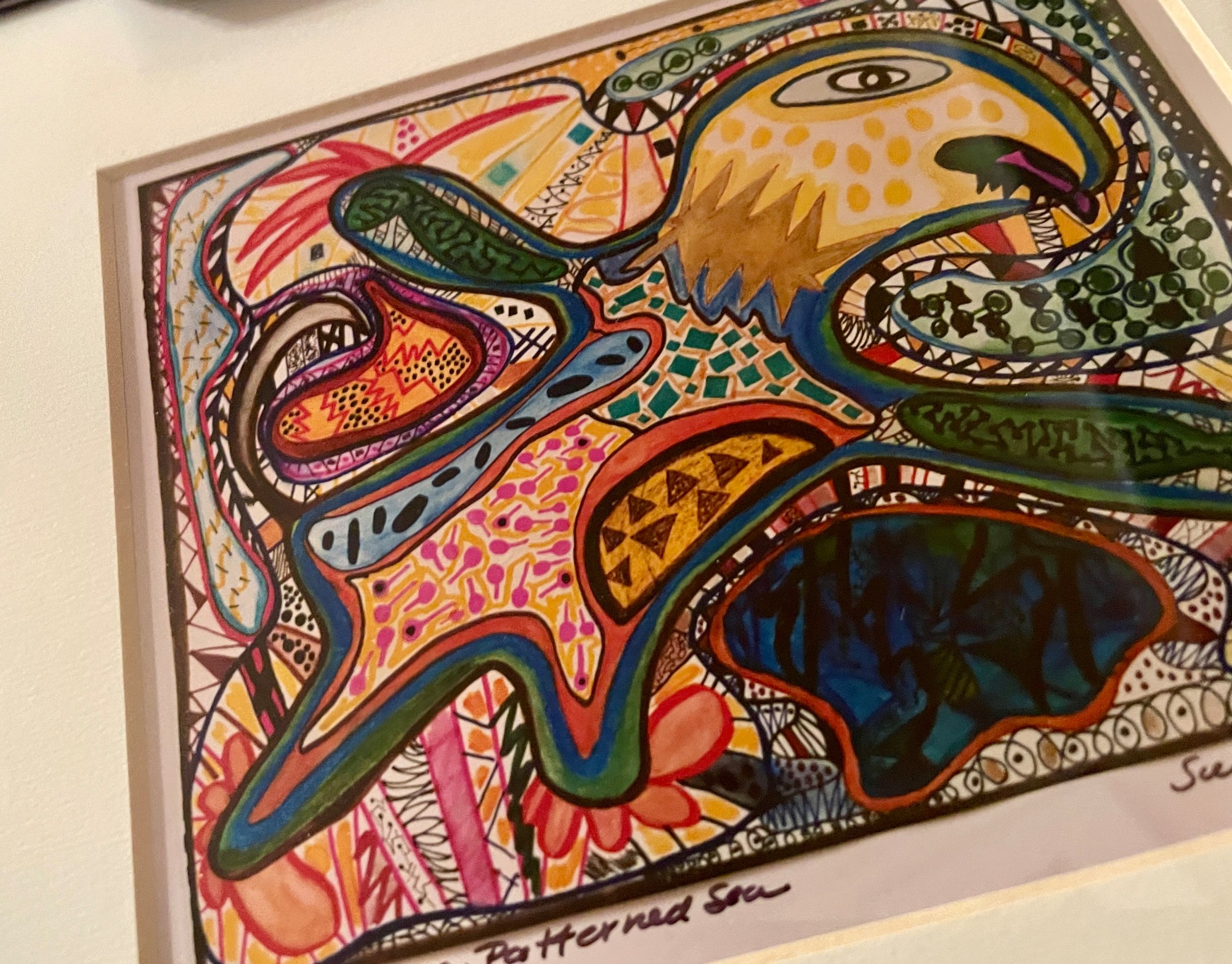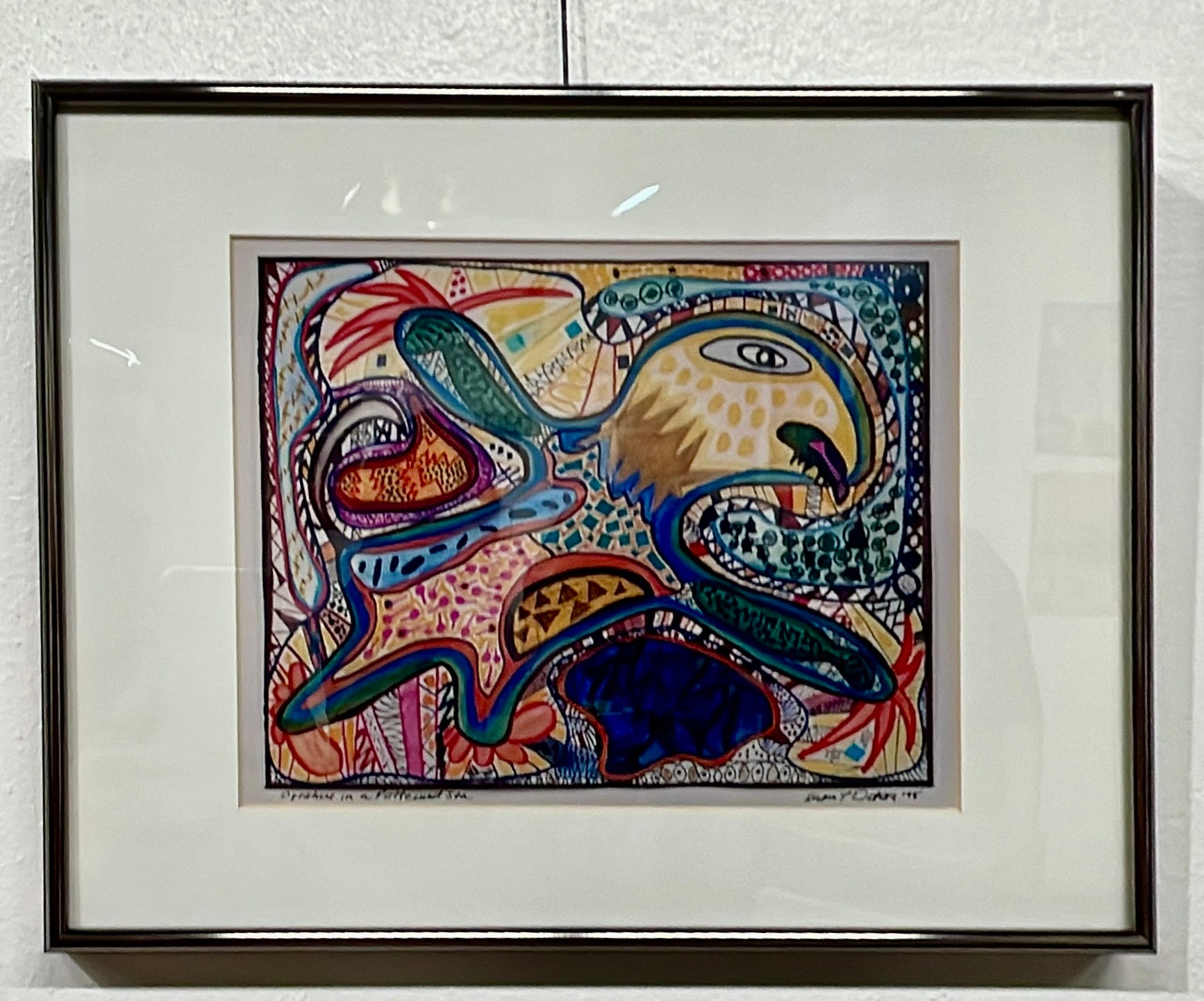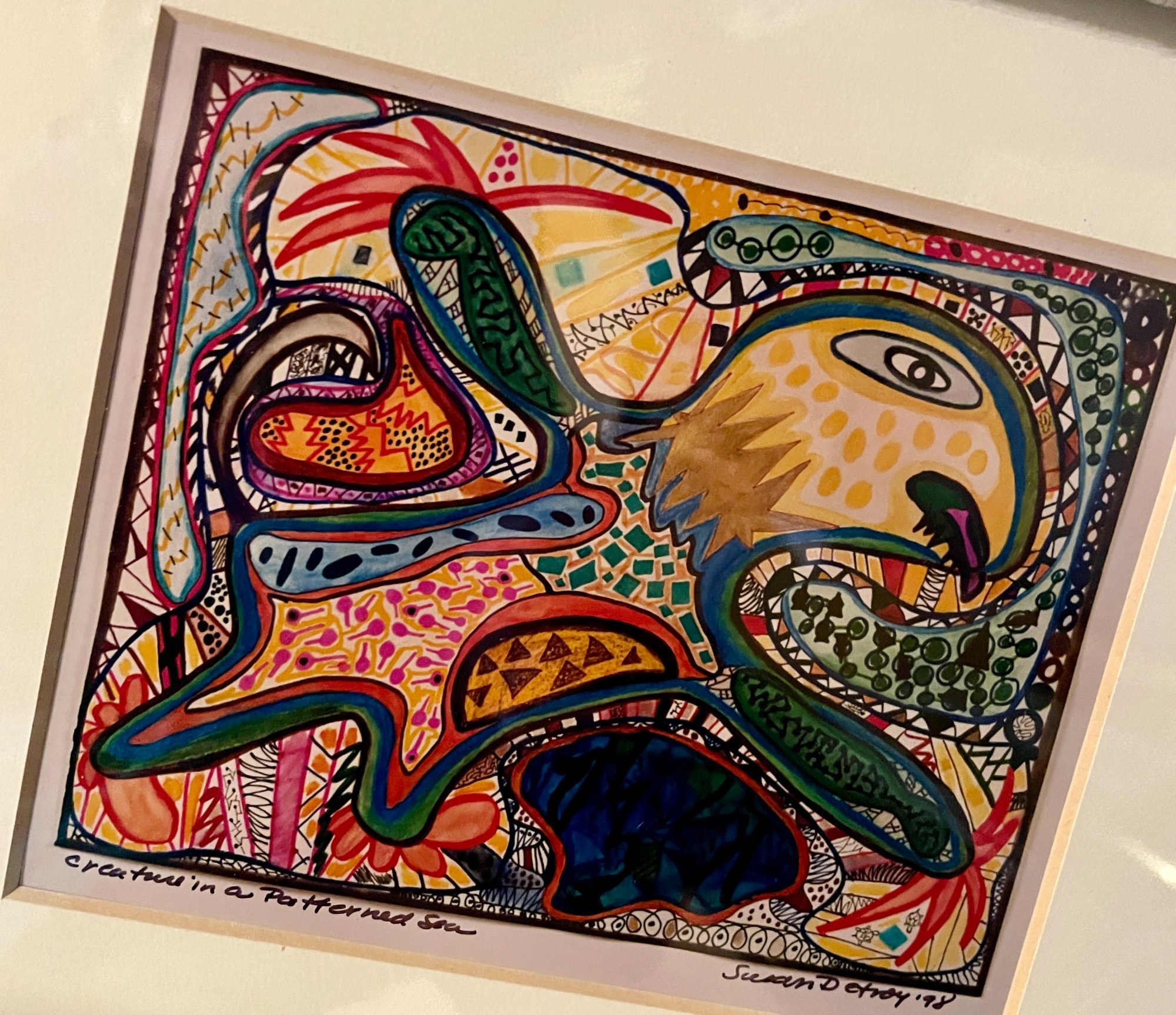 “Creature in a Patter de Sea” is one of the expansive tribe of drawings in “Mythic Animals” colorful, fanciful creations with universal spirit. The images completely cover the page with rich colors reminiscent of sacred archetypal forms similar to native or totem animals. They evoke a vision of animals based in earthy reality while created in a folkloric style
