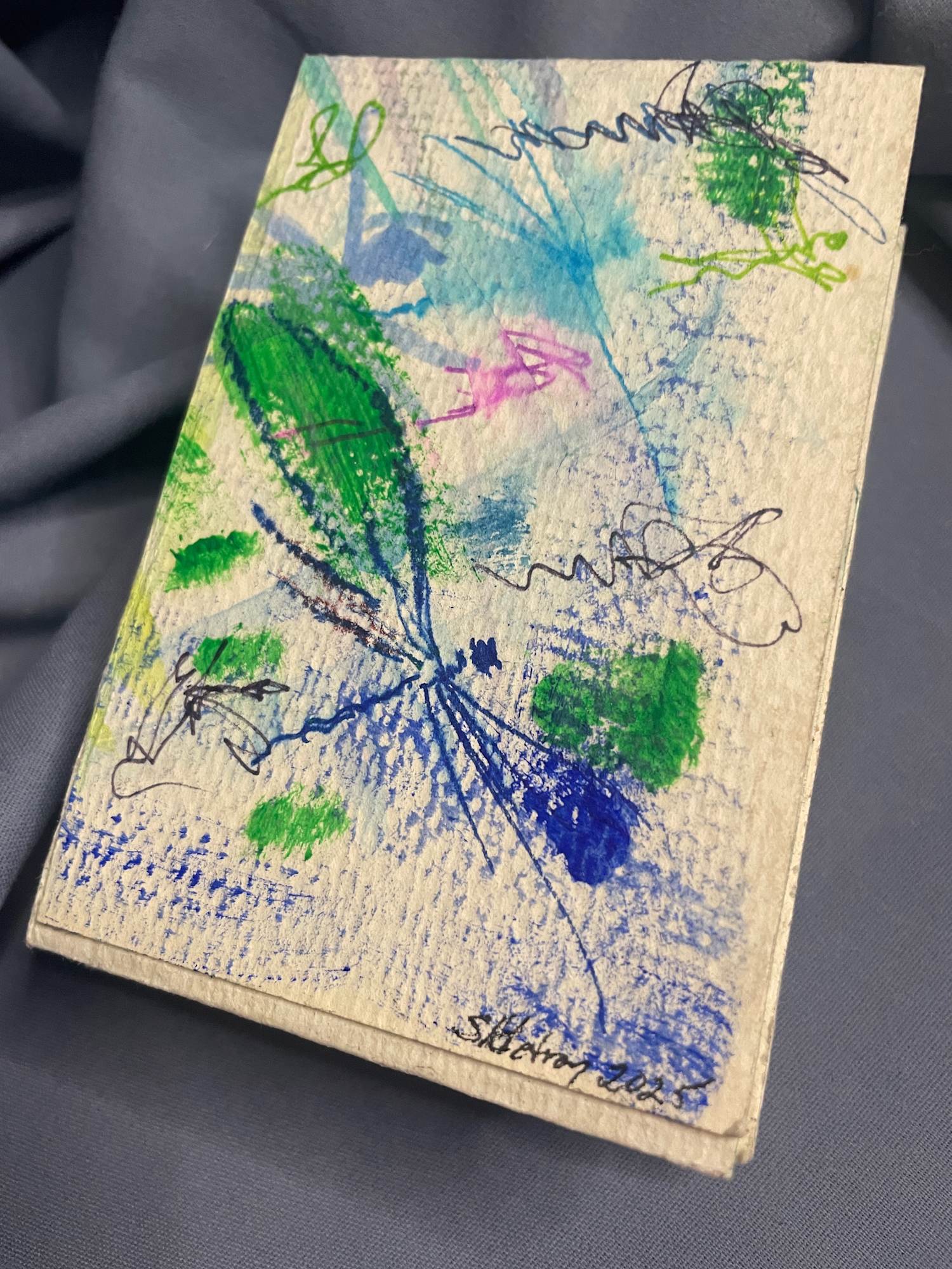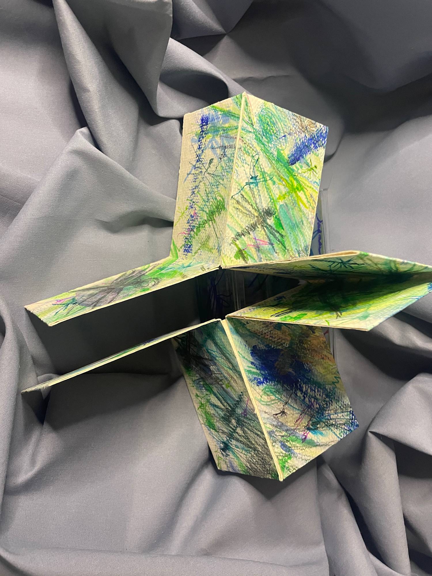 Front of folded sculptural book. Dragons-Fly was created over six months. If you’re interested in purchasing this piece, I will create a duplicate. My folded, sculptural dragonfly book incorporates many of my beloved analog techniques and themes. I began using dragonfly imagery in my art making in the early 90’s when I learned alternative historic photographic processes, producing one of a kind layered prints. Making the Dragons-Fly book is a natural pathway with the years of creating and calling on the inspiration of this stunning creature. The book shows my life long layering and combing style. I made the original designs with multiple coatings of acrylic paint, pen, pencil, watercolor, ink markers and transfers materials. The transfers employ a crosshatching matte medium method, utilizing color copies of previous artworks as the base images. I chose a blue and green color theme to fit the natural environment where I see dragonflies. As a visual story teller working in both analog and digital media, I am excited to offer this one of kind dragonfly book and traveling box. The book was created through out March into August 2025. The traveling box exemplifies another of my passions which is reuse and recycle. I am glad to find a use for the container to house the book and provide a safe journey. Dragons-Fly can be displayed in multiple positions with the traveling box.