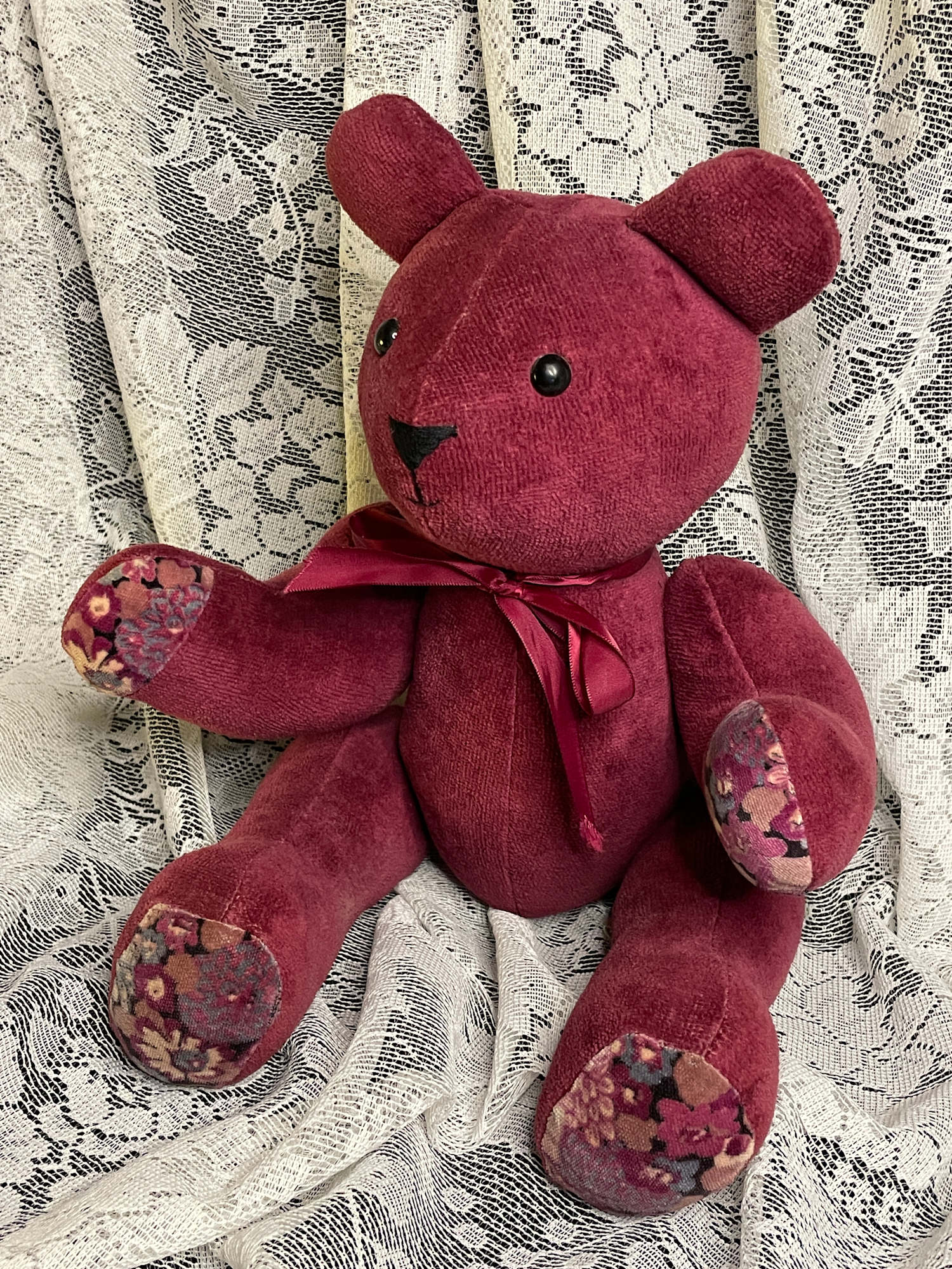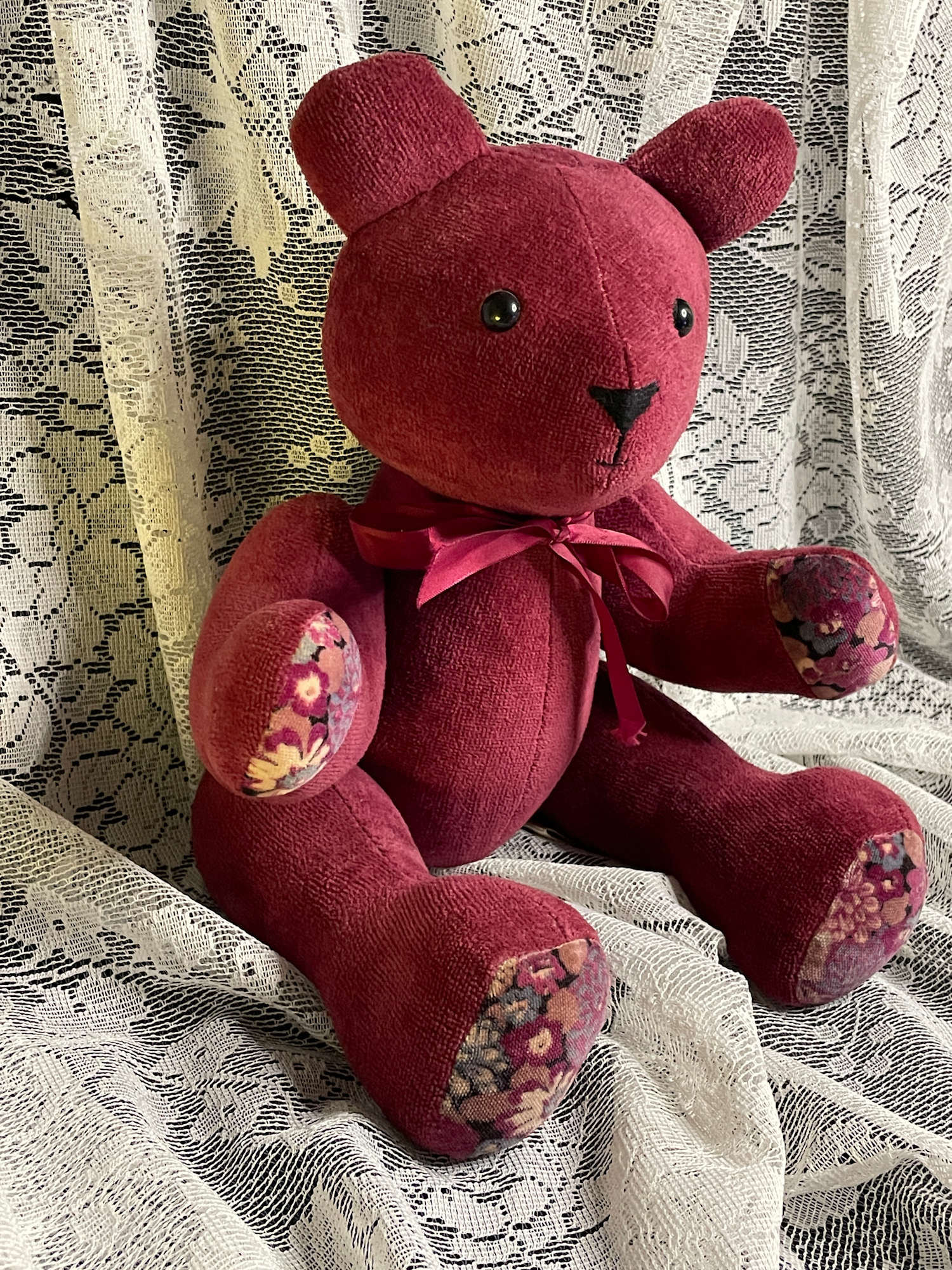Large, bear, jointed limbs, red, fabric, flowered pads, one of a kind, hand crafted