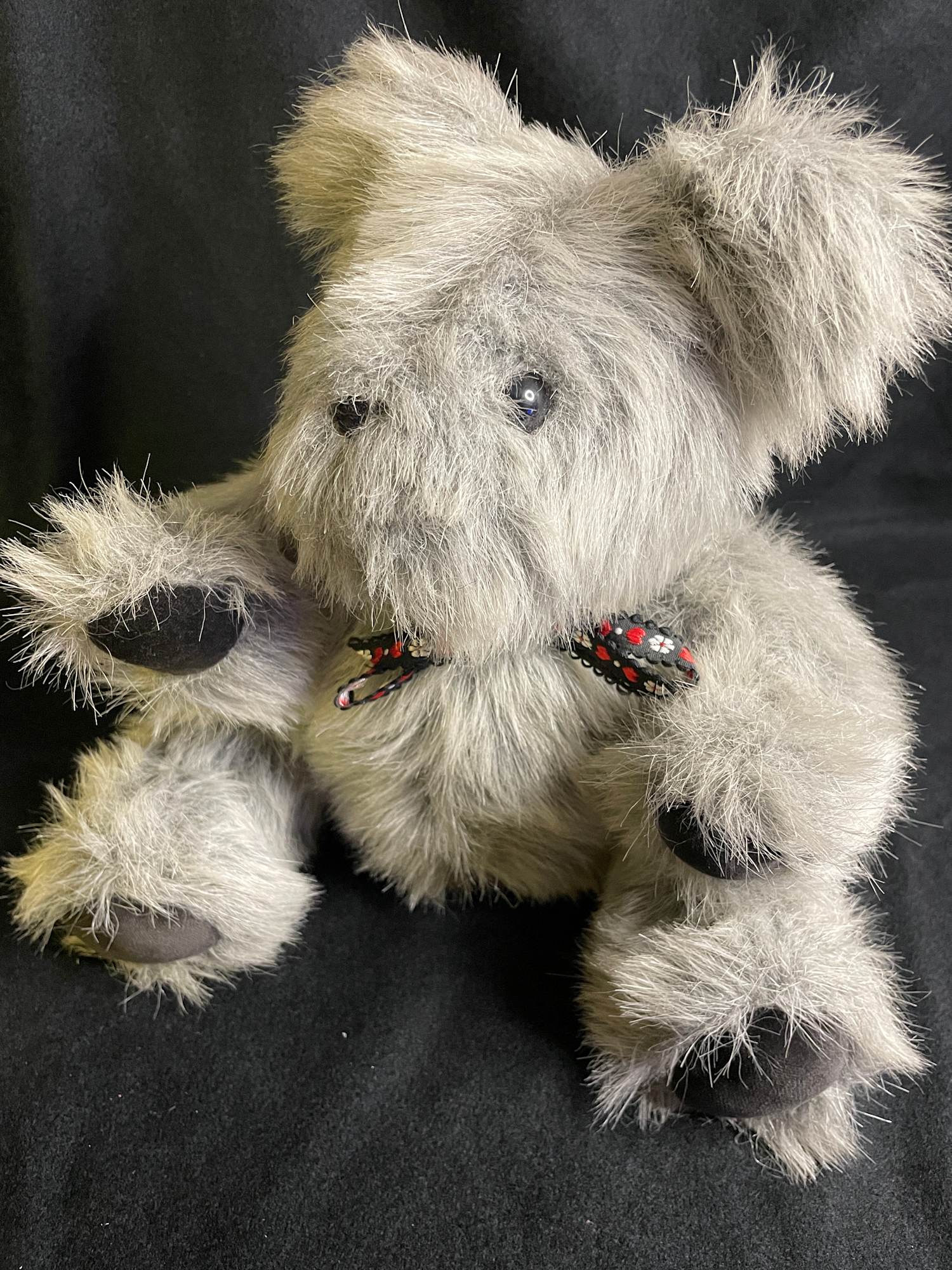 A fun large bear with fuzzy fur and gray pads. Handcrafted.