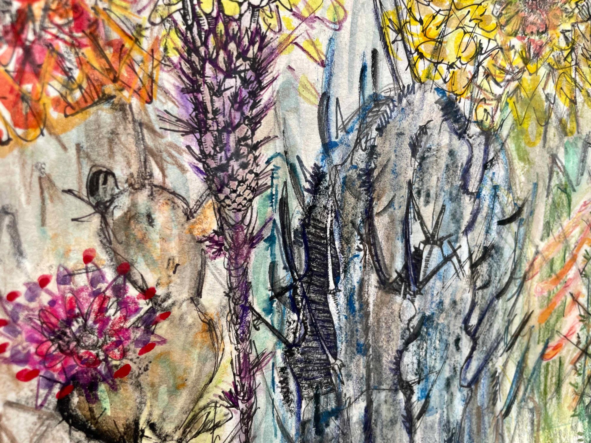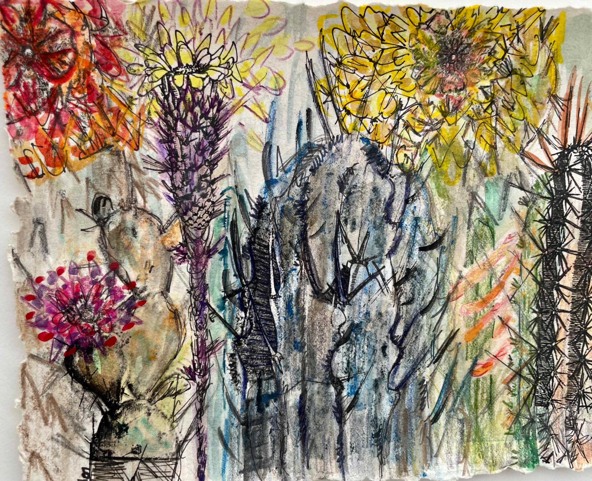 "Row" is one of several pieces inspired by Cactus in their diversity of form. The series is called "Worship of Precious." This piece has a great symmetrical row of cactus and cactus flowers. Artworks in the collection are a mix of transfers prints, watercolor, pen and pencil. Each artwork is one of a kind, worshipping the wonder of plants in our earthly existence.