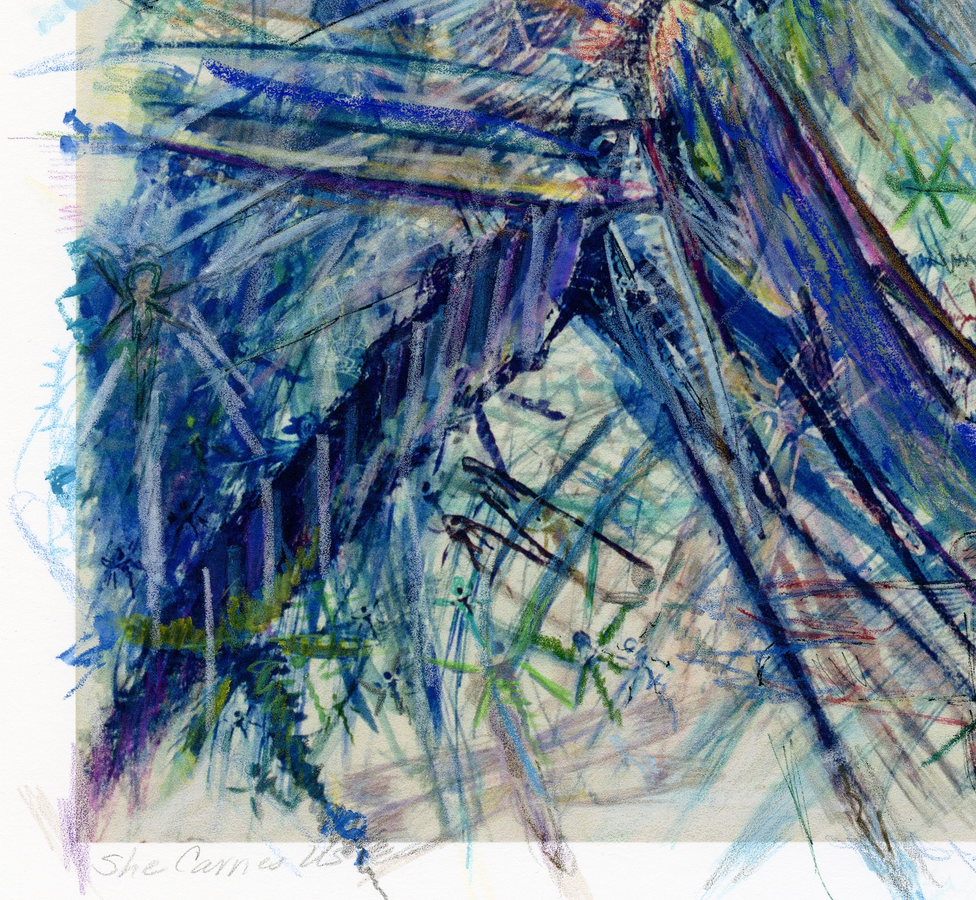 A uniquely created print echoing transfer, cyanotype dragonfly artworks from the "Worship of Precious" series. Dragonfly imagery offers symbolic meanings of transformation and evolution.