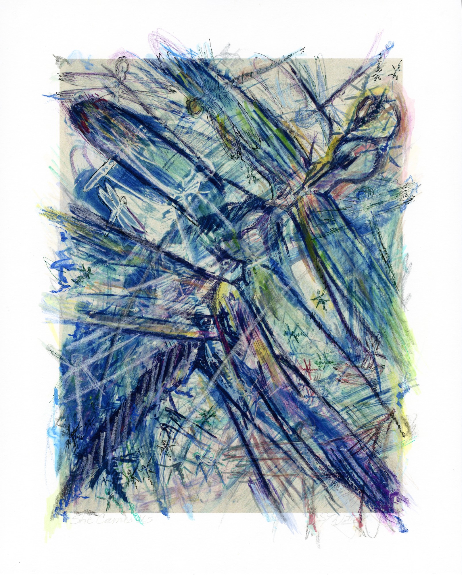 A uniquely created print echoing transfer, cyanotype dragonfly artworks from the "Worship of Precious" series. Dragonfly imagery offers symbolic meanings of transformation and evolution.