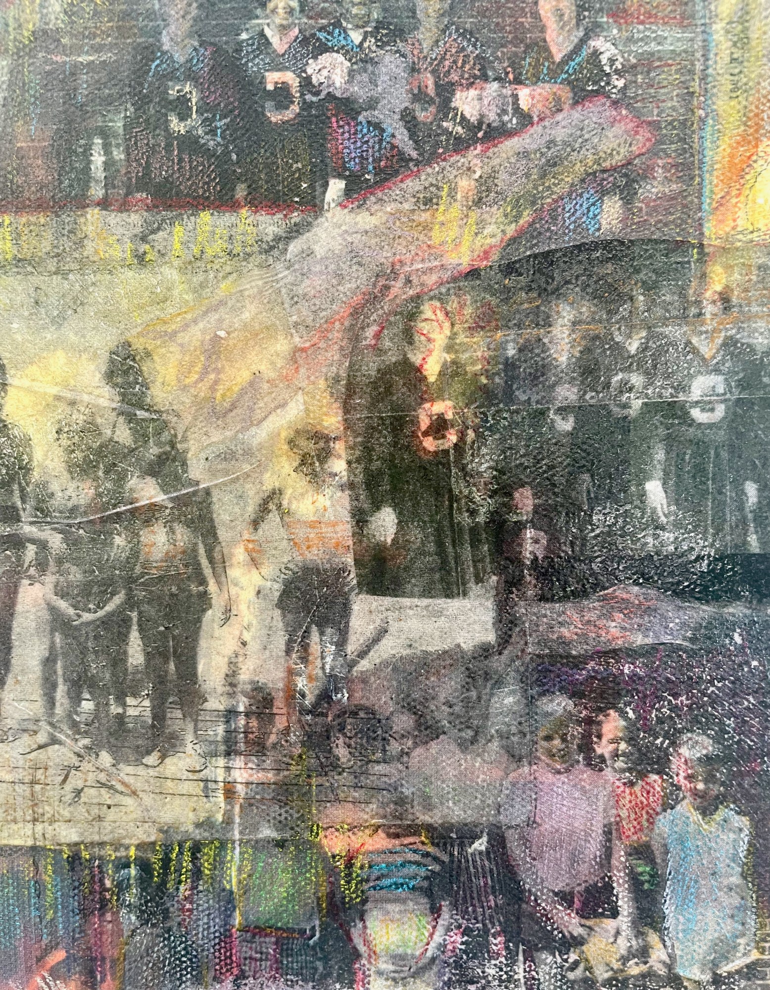 My young life included swimming with adolescent friends and being part of the junior varsity cheerleading squad. I gathered my favorite photos making lifts to cover an older canvas piece. This art is a redesign and a repurpose piece. .