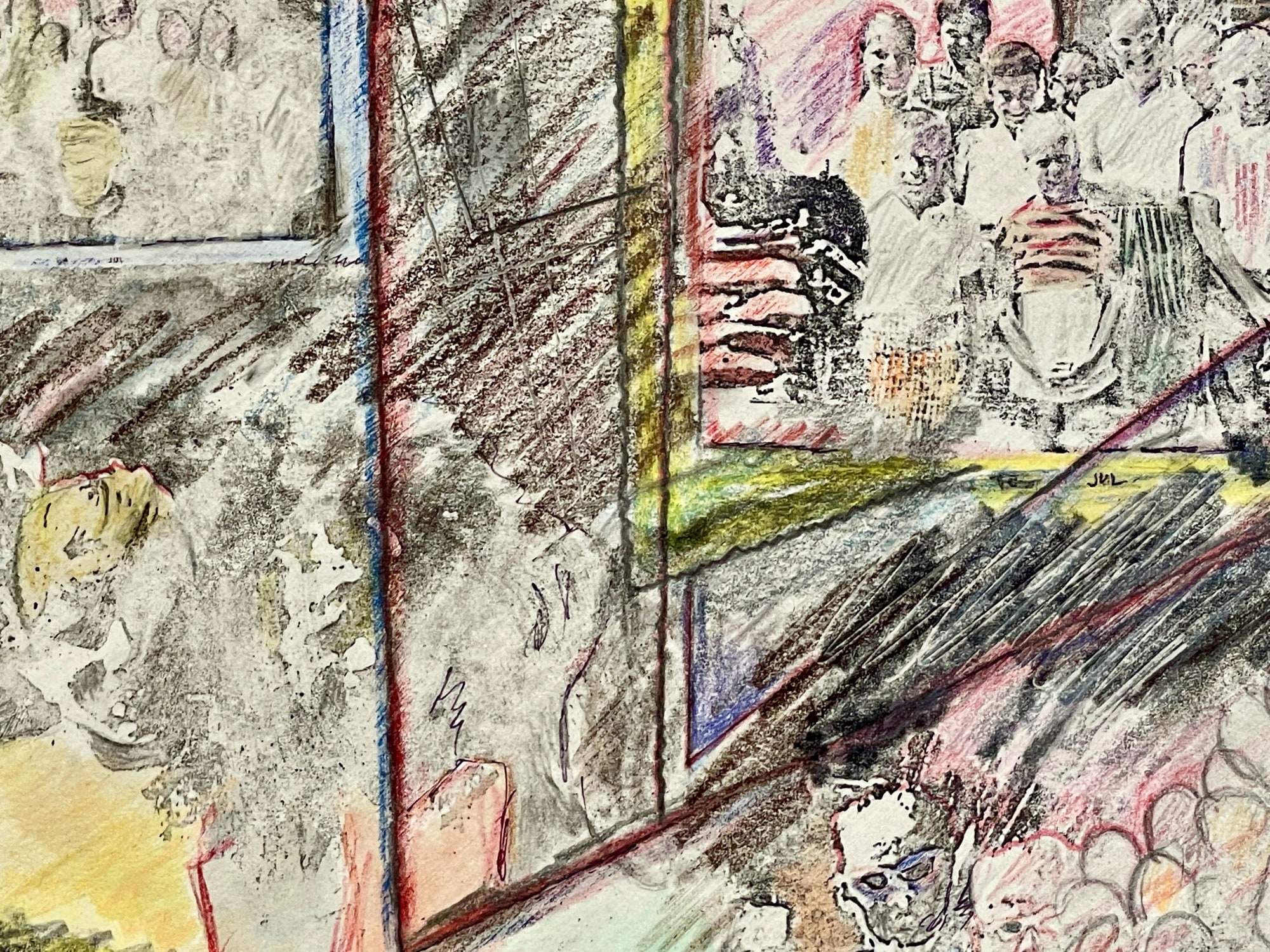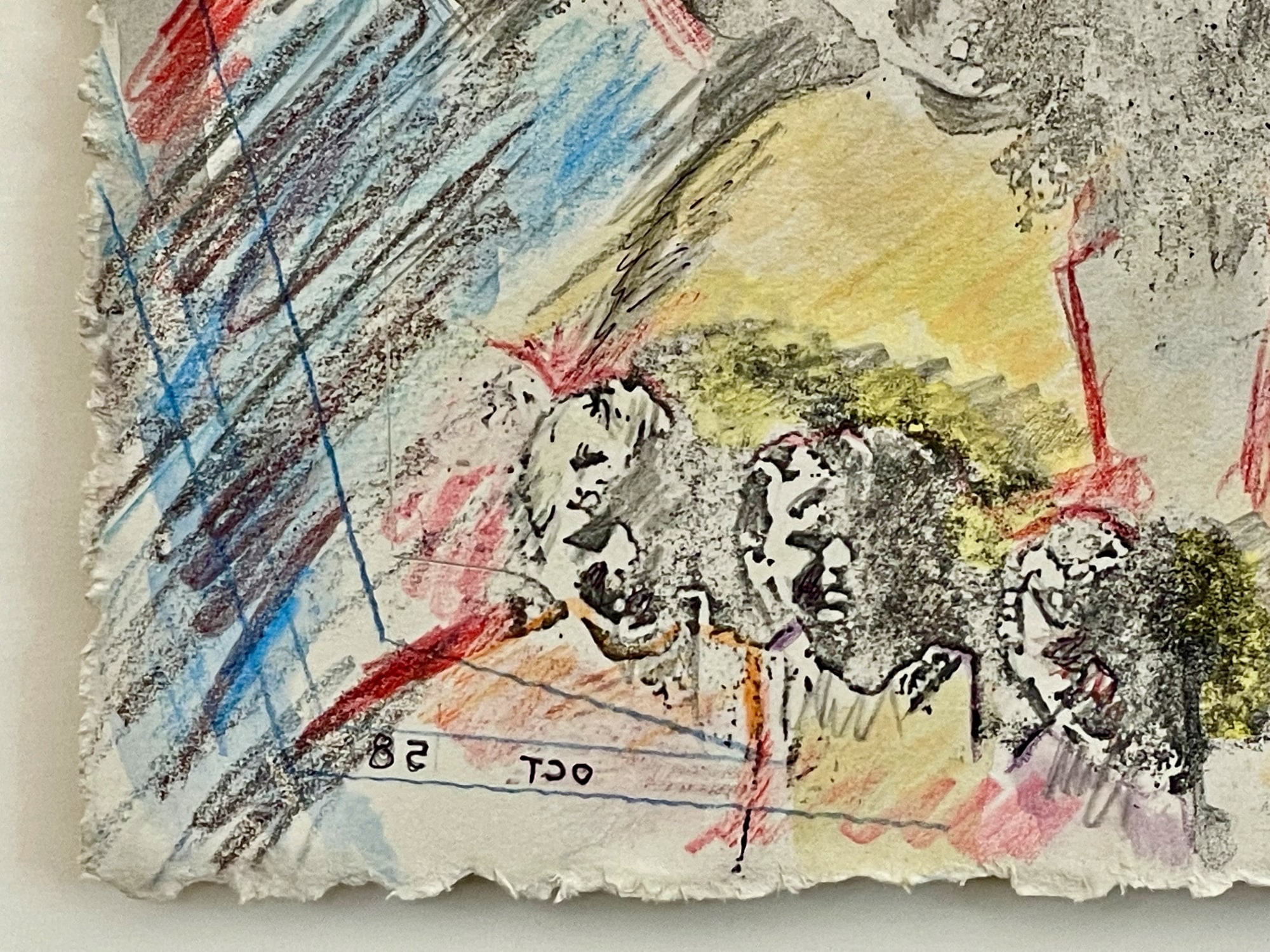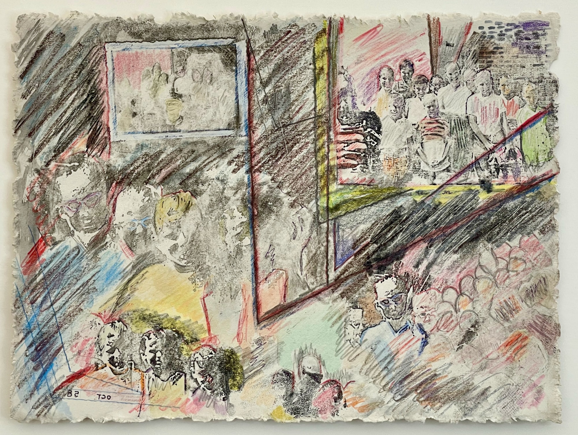 “Swimming 58” is part of the “One Life” series. These artworks are pieces utilizing them of family life, childhood and self reflection. I grew up in the boot toe of Indiana, where summer swimming was a regular child hood activity. It was hot and we wanted to see our friends and jump in the pool. I had several girlfriends who often went swimming and sometimes threw birthday parties at a pool Here I am the featured birthday gal.