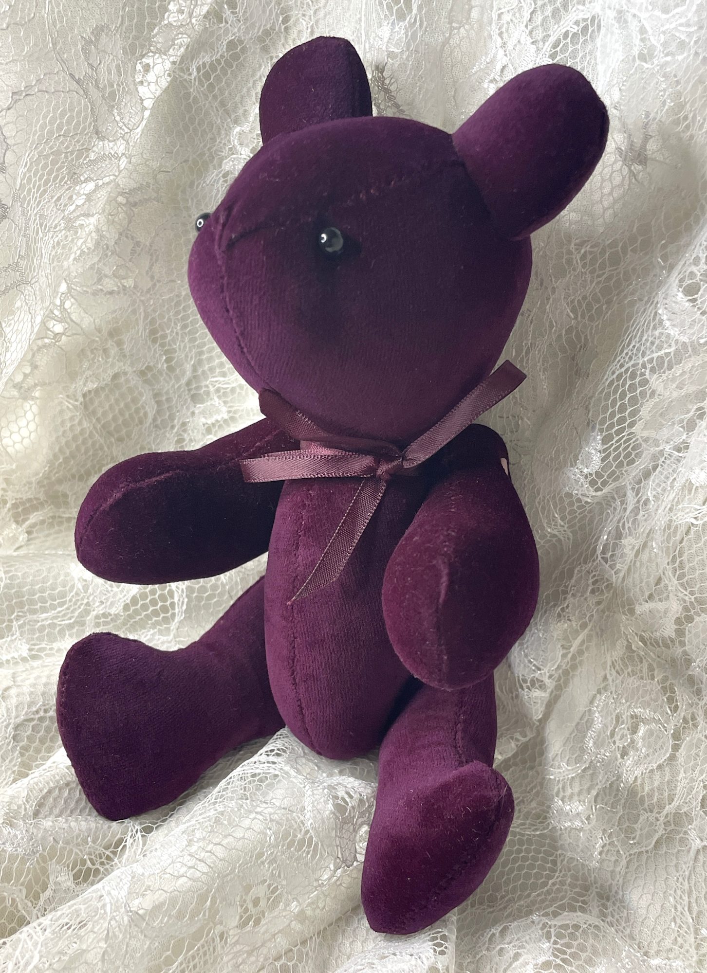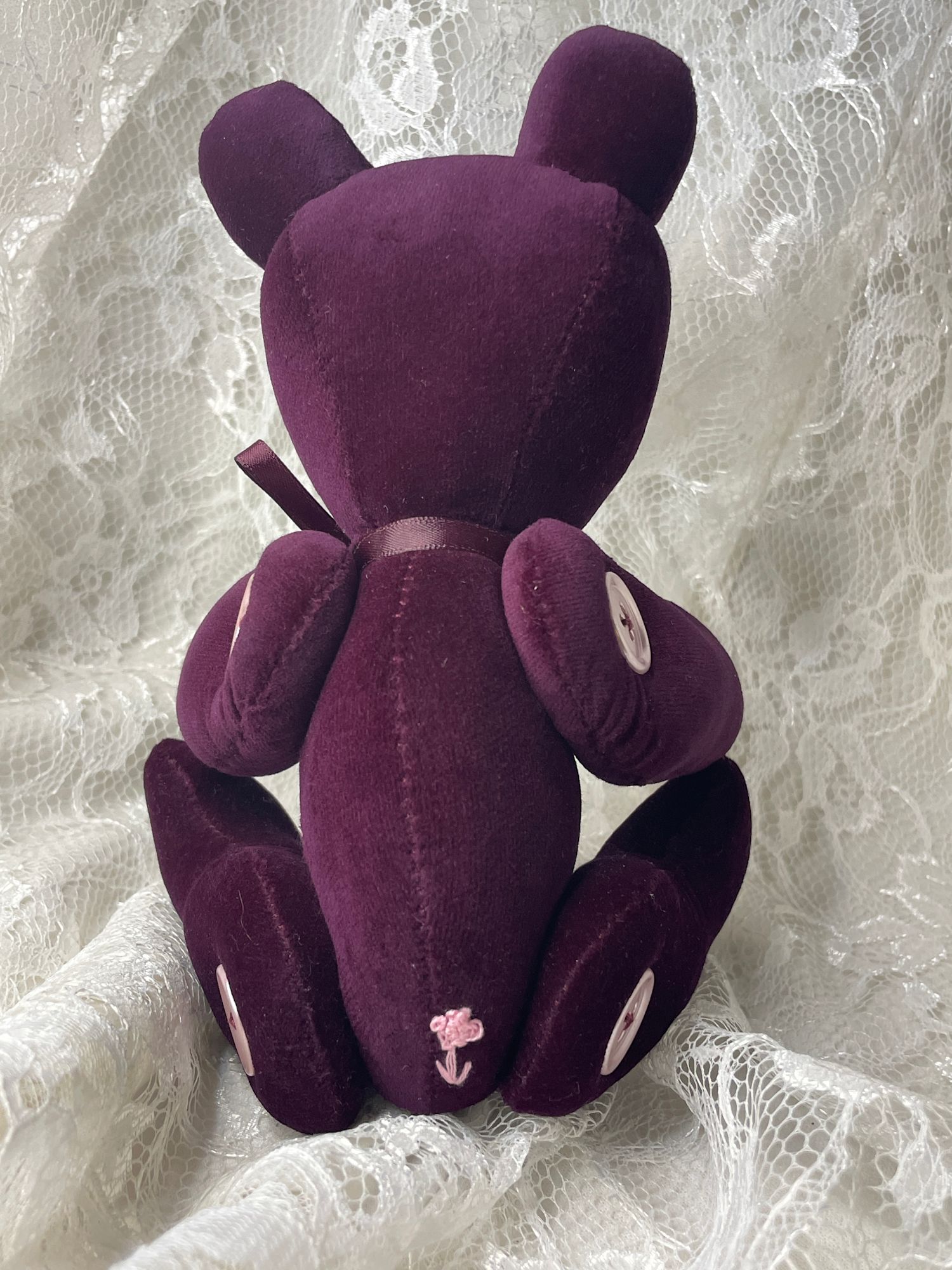 Medium, red velveteen bear, button jointed limbs, sachet, rose.