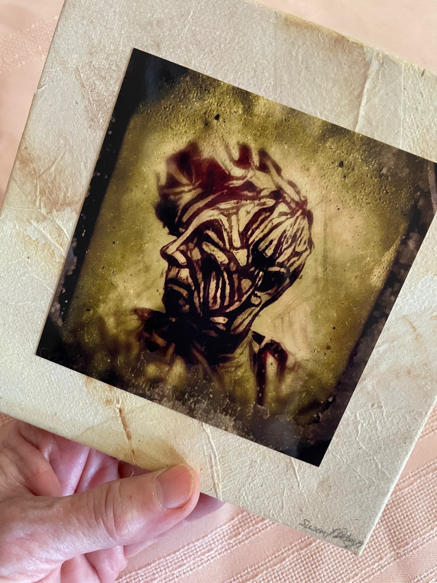 The image as well as all the pieces in the “Evolution” series, is based in the "Portrait of a Woman" project. The small pieces use recycled teabag papers along with digital images and watercolor paint.