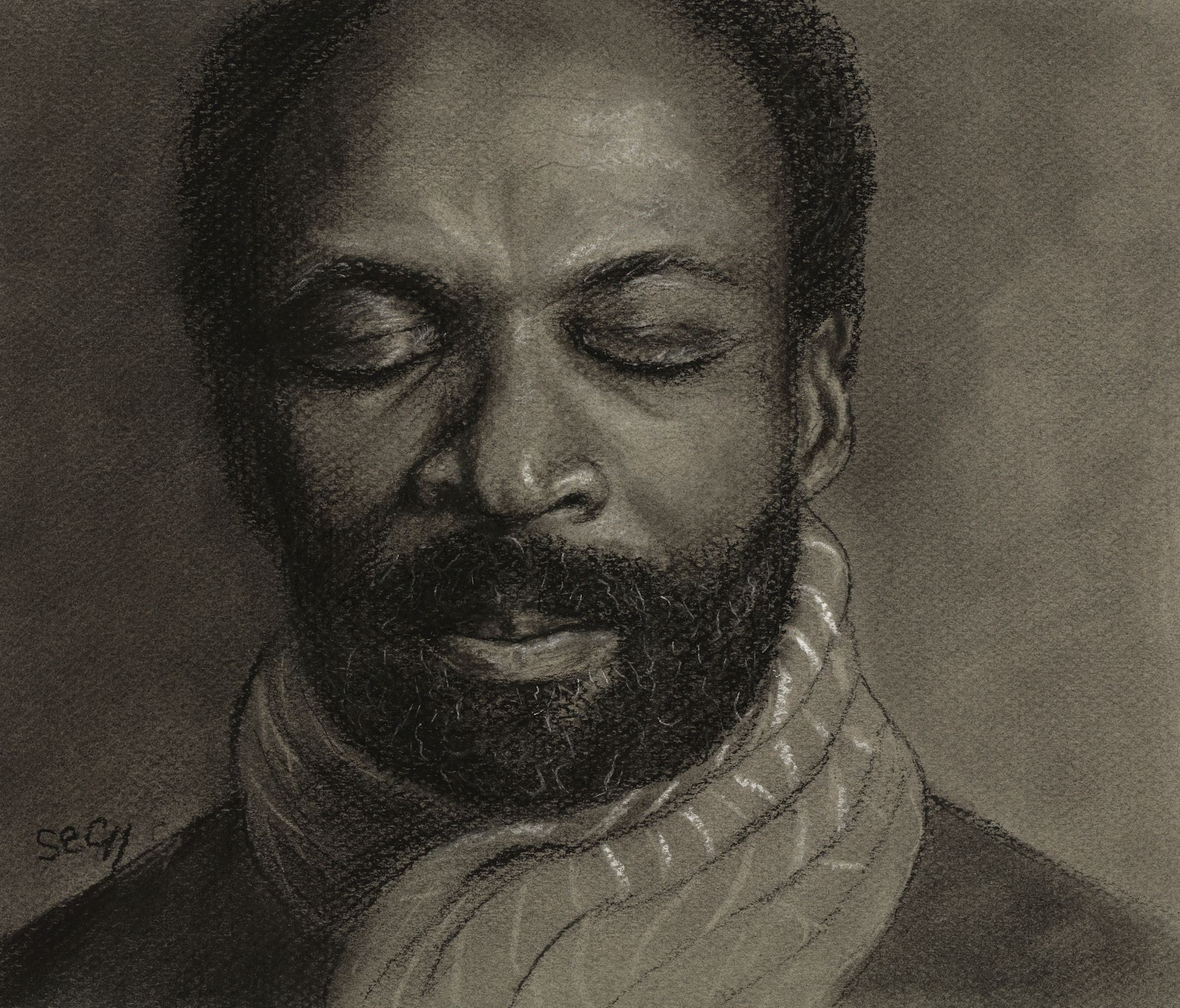Charcoal on MiTeintes paper in warm woodtone frame, 12"x13", with off white mat and Optium Museum Acrylic glazing.