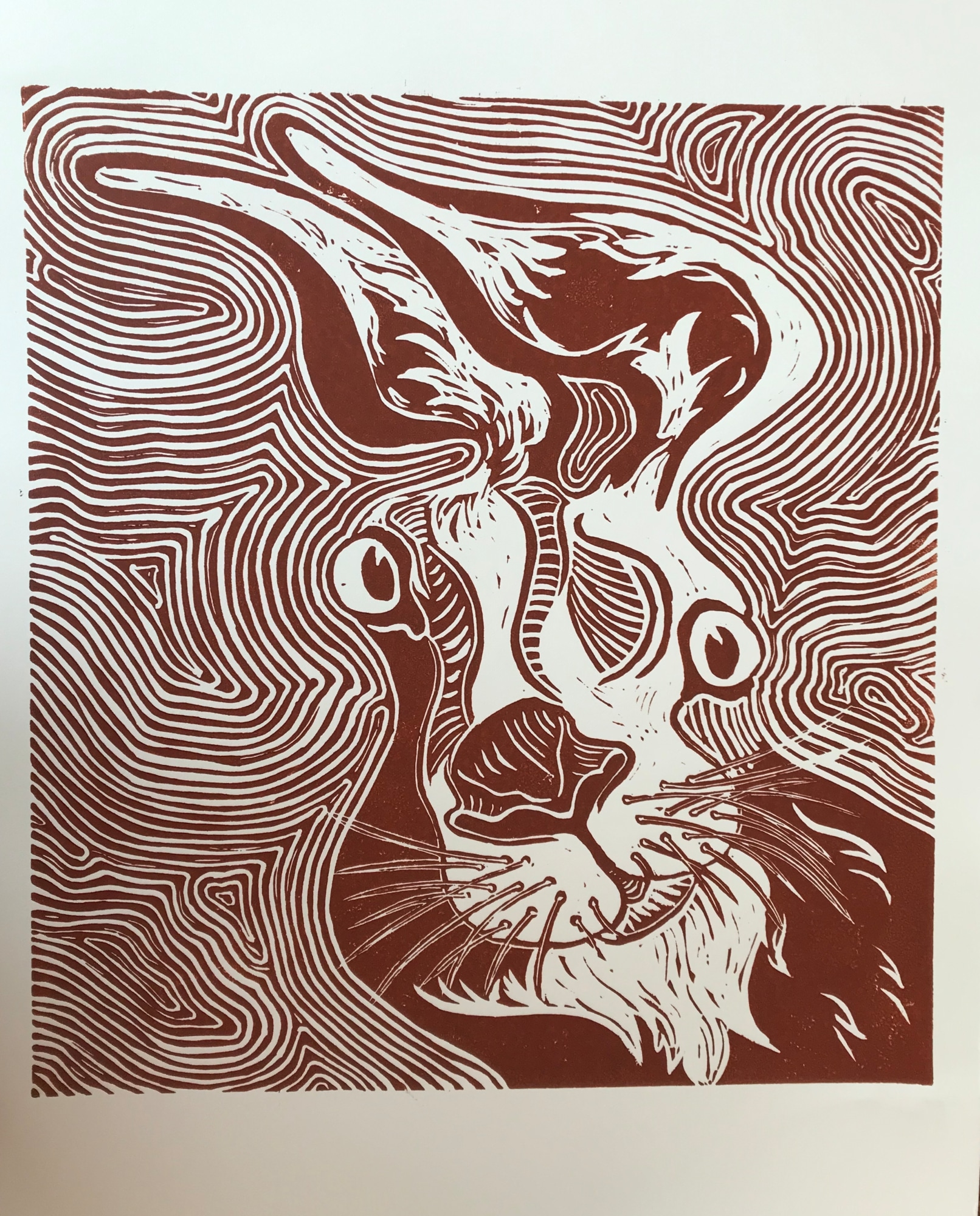 Relief print on #300 Arches hot pressed Aquarelle paper with Daniel smith Burnt Sienna Relief Ink.