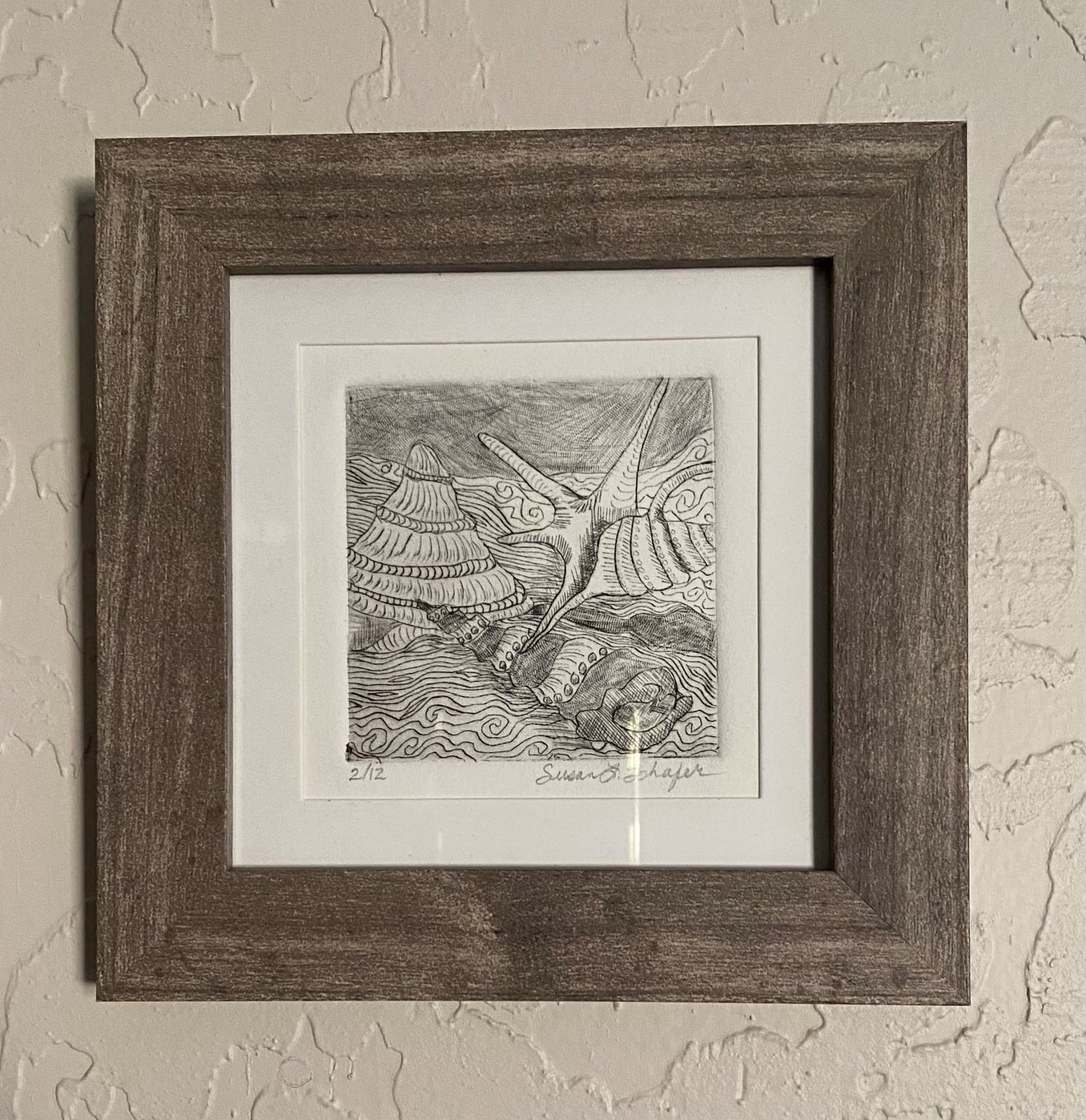 Dry-point etching on zinc plate, printed in black ink on BFK Rives paper. $55 framed (0.5-inch white matte in 6.5 x 6.5-inch light gray frame, 5 x 5-inch inner dimensions of frame) .