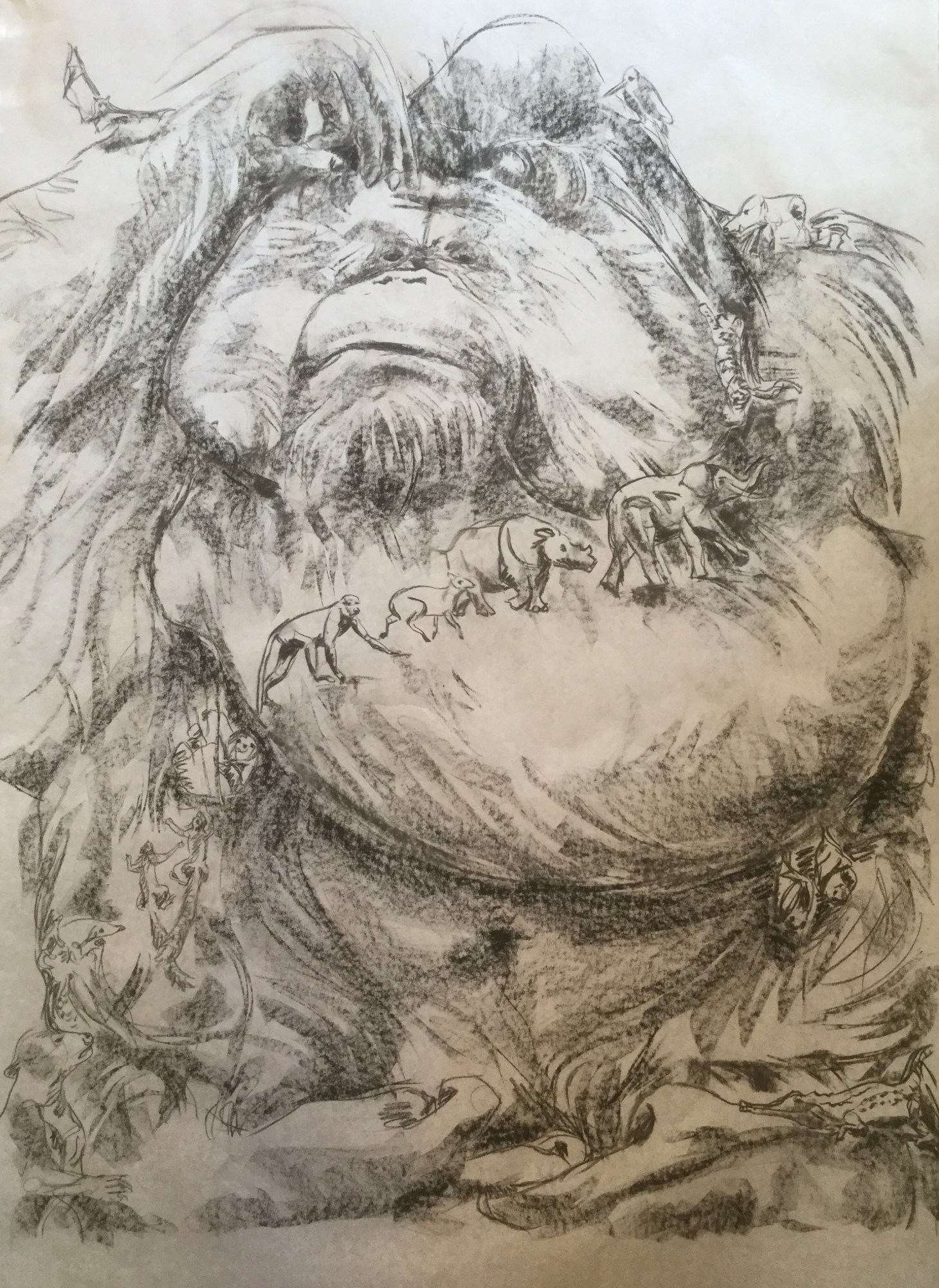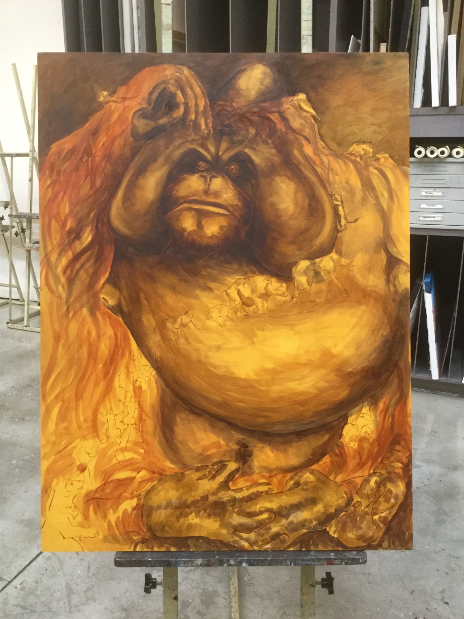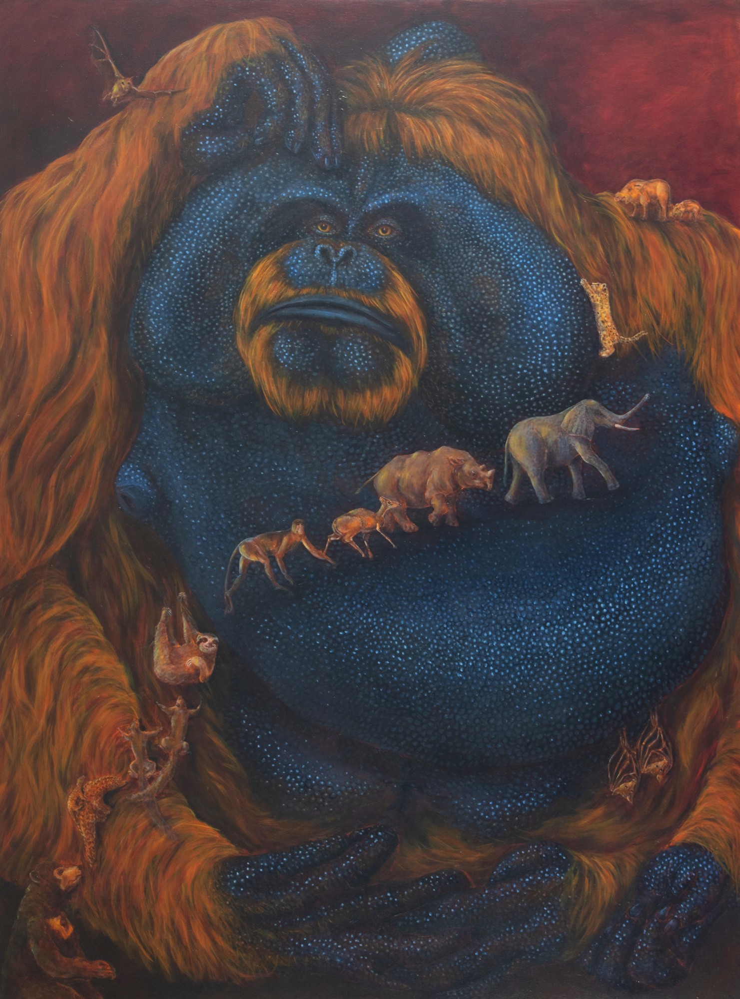 Inspired by some of the endangered animals of Borneo that are on the road to extinction, along with so many animals around the world that are struggling to survive against the onslaught of humans who destroy habitats and use, abuse, and kill them. This is a dark painting that will require good lighting. Shown at the San Luis Obispo Museum of Art in 2019.