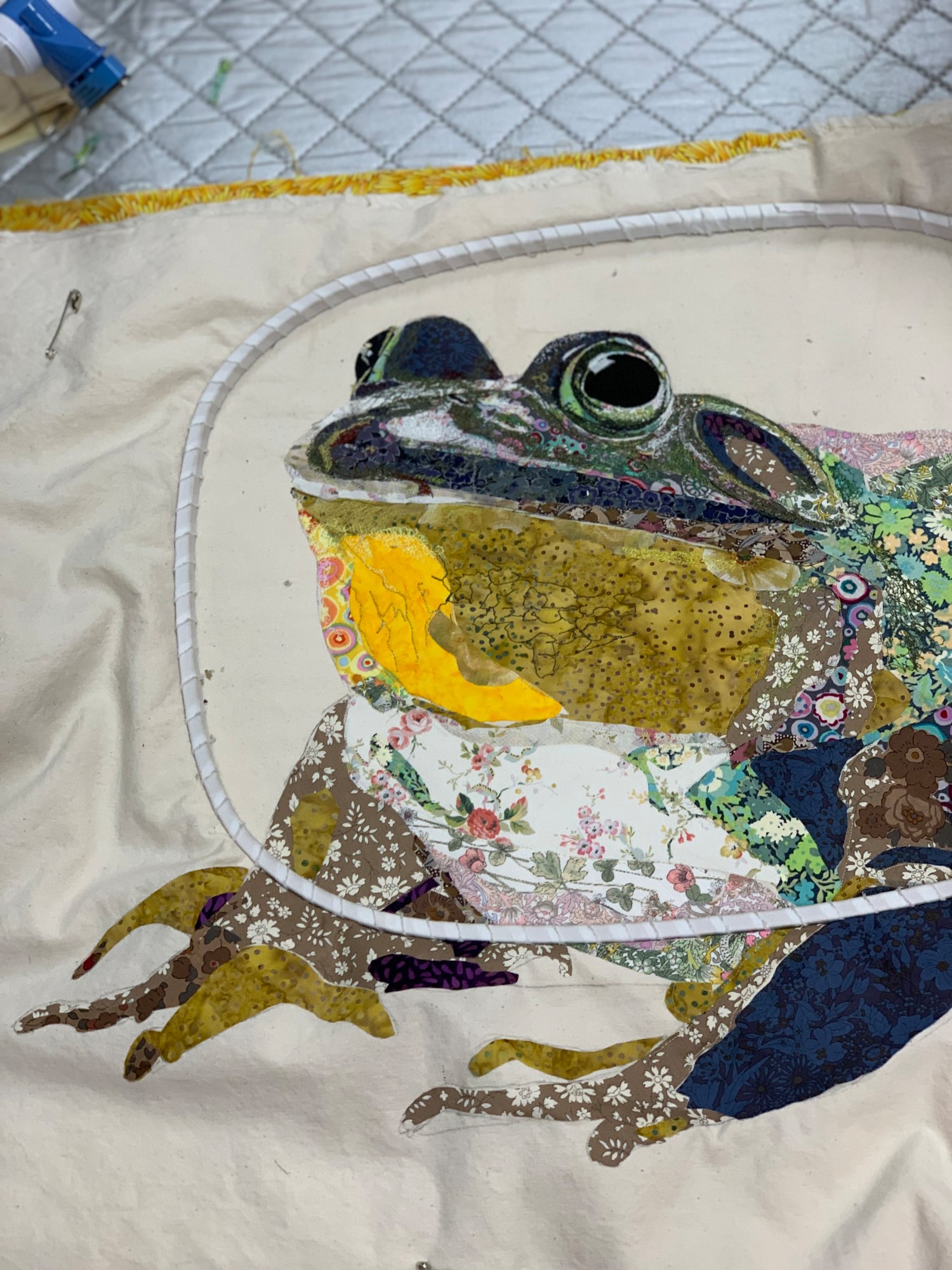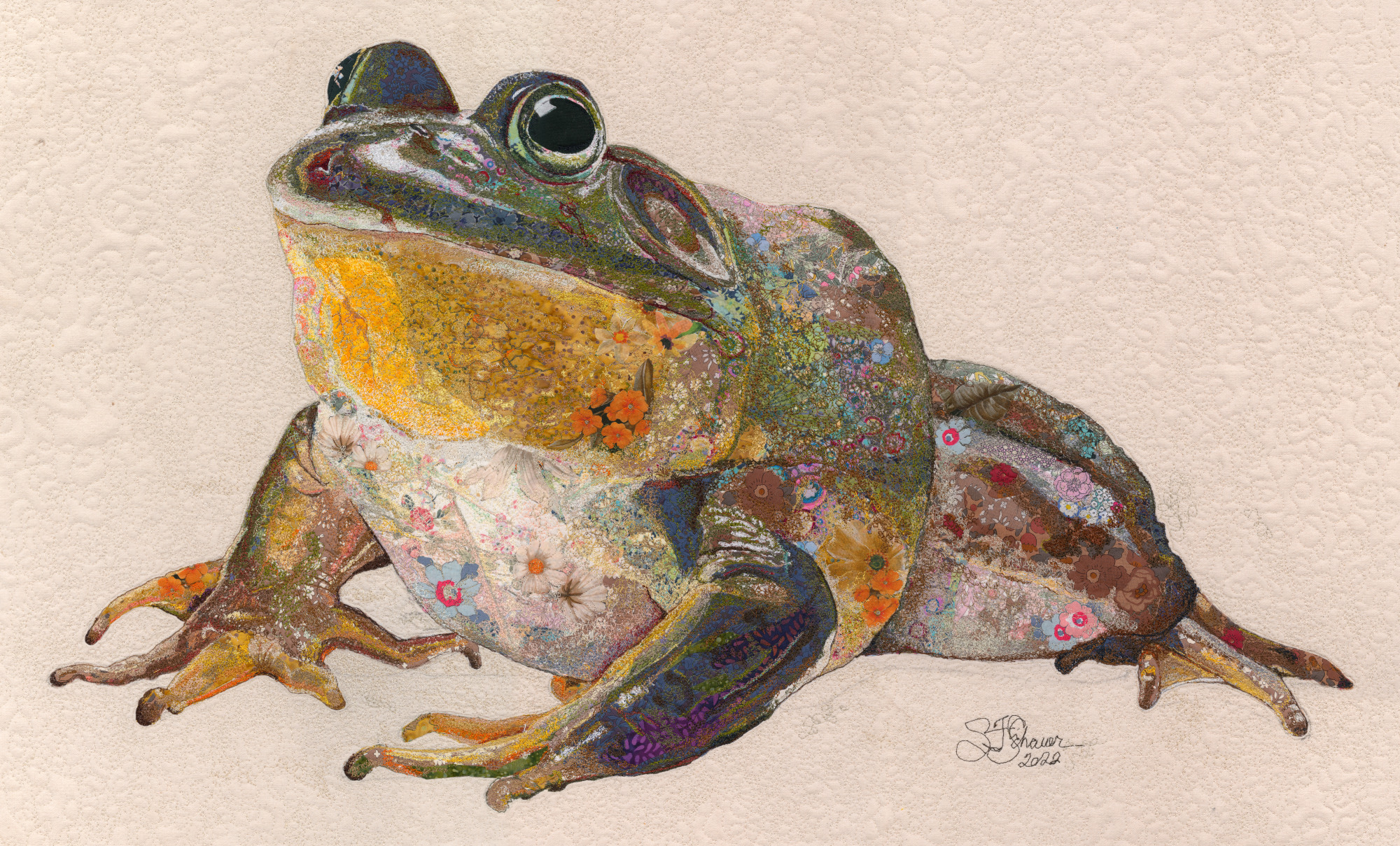 Bullfrogs are brown to green in color, often with dark brown spots. Their bellies range from white to yellow and are sometimes marked with black spots or patterns. Their hind feet are fully webbed.