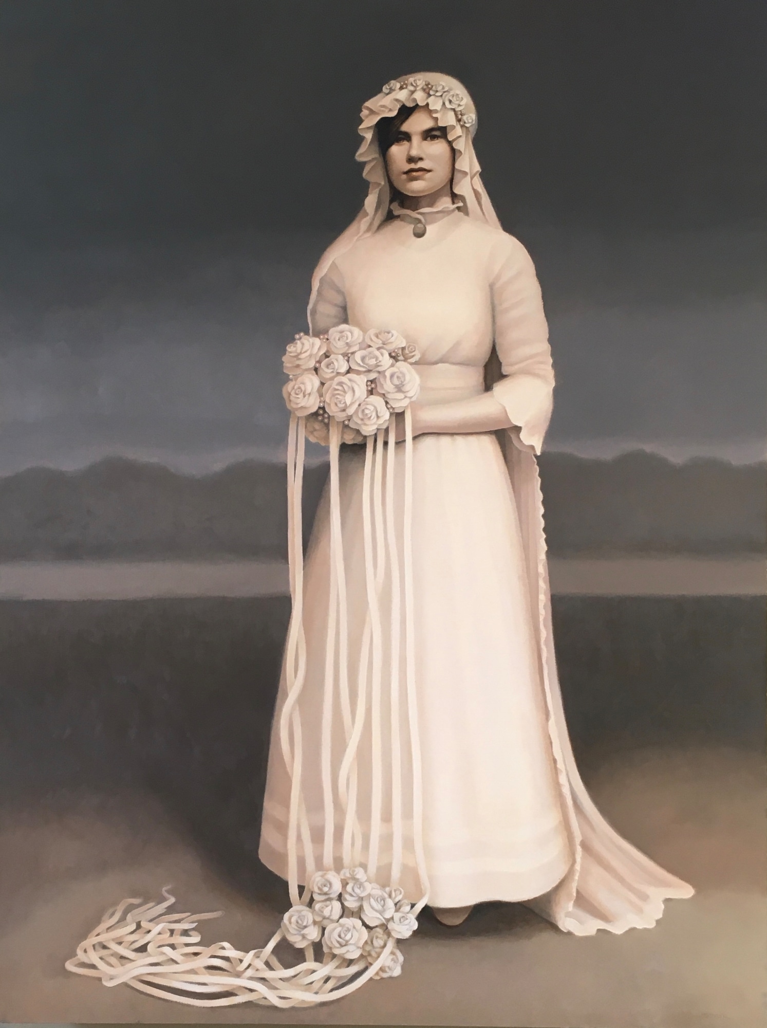 I was inspired to create this sepia painting of my Polish grandmother from an old family photograph taken in 1915 on her wedding day. She was holding this amazing double tiered bouquet that fascinated me. I also wanted to commemorate her strength, beauty, and bravery for immigrating to the U.S. when she was only 17 with only her younger sister. I changed the background to reflect a sense of the unknown. Also, I recreated the flowers in her bouquet with my own selection of white roses because the bouquet in the photo was very indistinct. As a child, I called her Babcia, which is Polish for grandmother. I knew her, but not well. It was a very special experience for me to create her wedding portrait in this beautiful dress. While painting, I felt that I was renewing my relationship with her, even though she passed a long time ago.