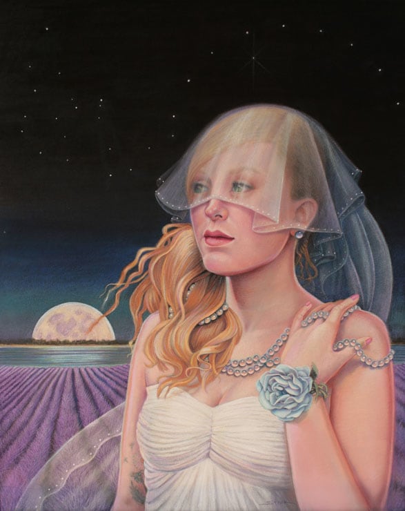 Conceptual portrait of a woman preparing to marry. The Bride is wearing a necklace of water drops and a blue rose corsage, both symbols of deep emotions. The background represents feminine elements the model loves: water, lavender, and the moon.