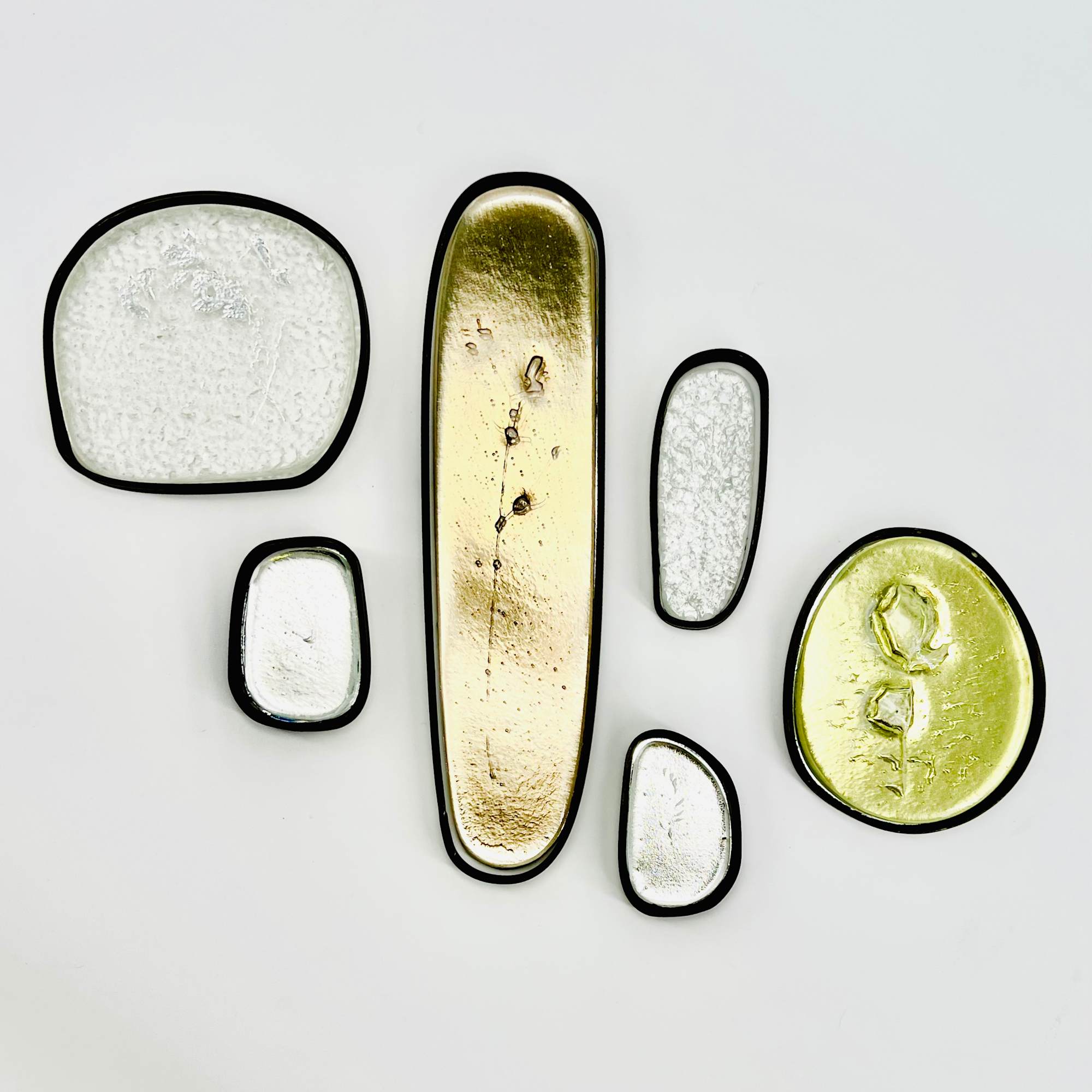 These are material studies I've been testing out for my new body of work. I've experimented with direct casting in stainless steel with these pieces. I've also used iridescent and a rhubarb striker that had intriguing results that I'd like to explore further. One sample shows the use of course frit to create an undulating water-like surface. That piece also plays with the reflective qualities of silver leaf instead of mirroring.