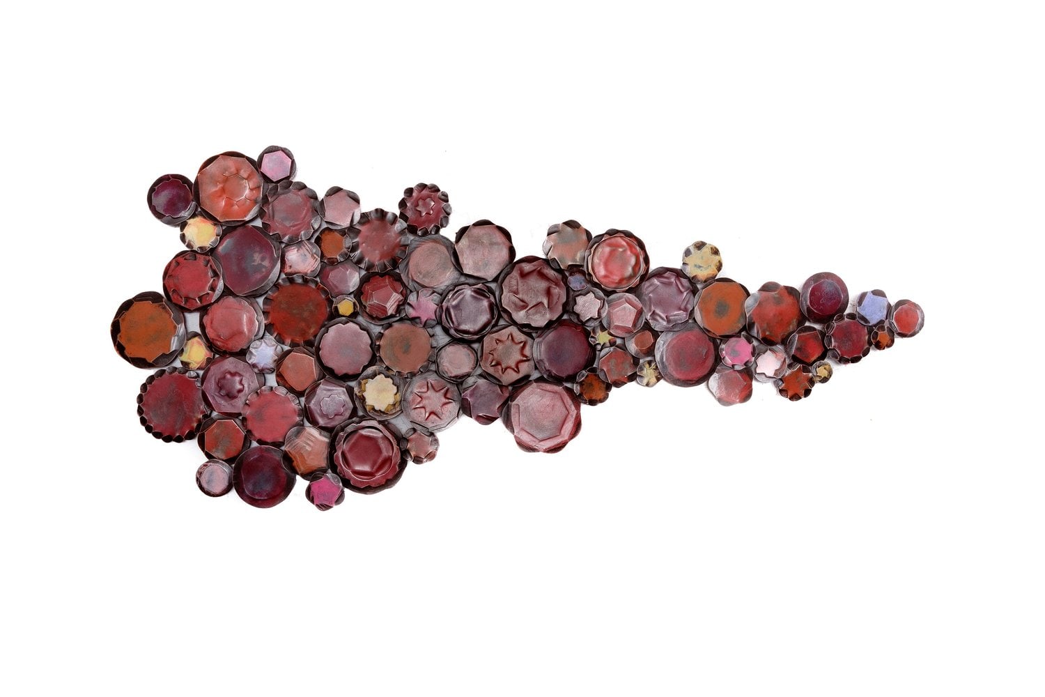 This wall sculpture is a floating cloud of color created from many expertly hand-forged steel disks detailing a wonderful variety of textures, patterns, and colors. Artist Susan Madacsi merges her long time interest in street art in her inspirational use of aerosol enamel paints in her work. Each piece is unique; exact colors and arrangement of elements will vary.