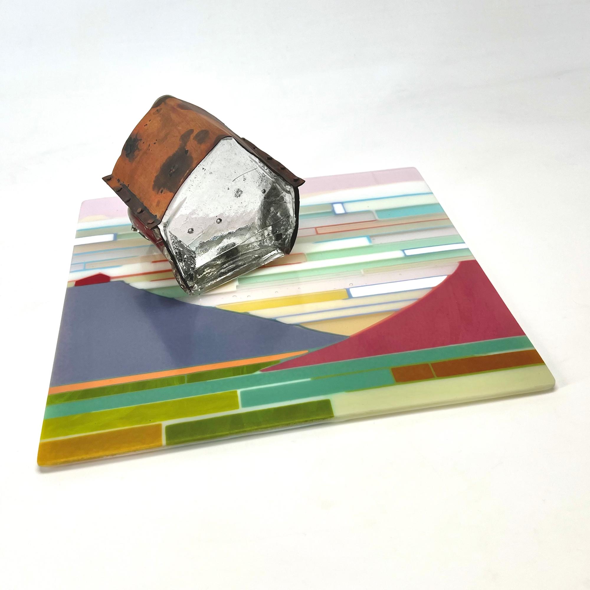 This piece merges two personal memories: one from childhood and the other from a farm property I owned as an adult. The hand built riveted copper structure, inspired by a simple yet striking corn crib on the farm, is filled with hand-ladled clear glass that speaks to both fragility and strength.