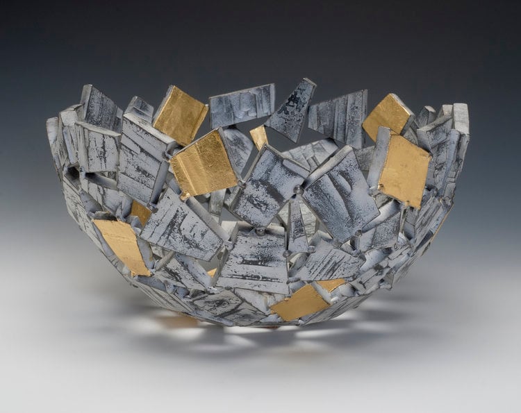 Forged and fabricated steel with aerosol enamel paint and 23k gold leaf