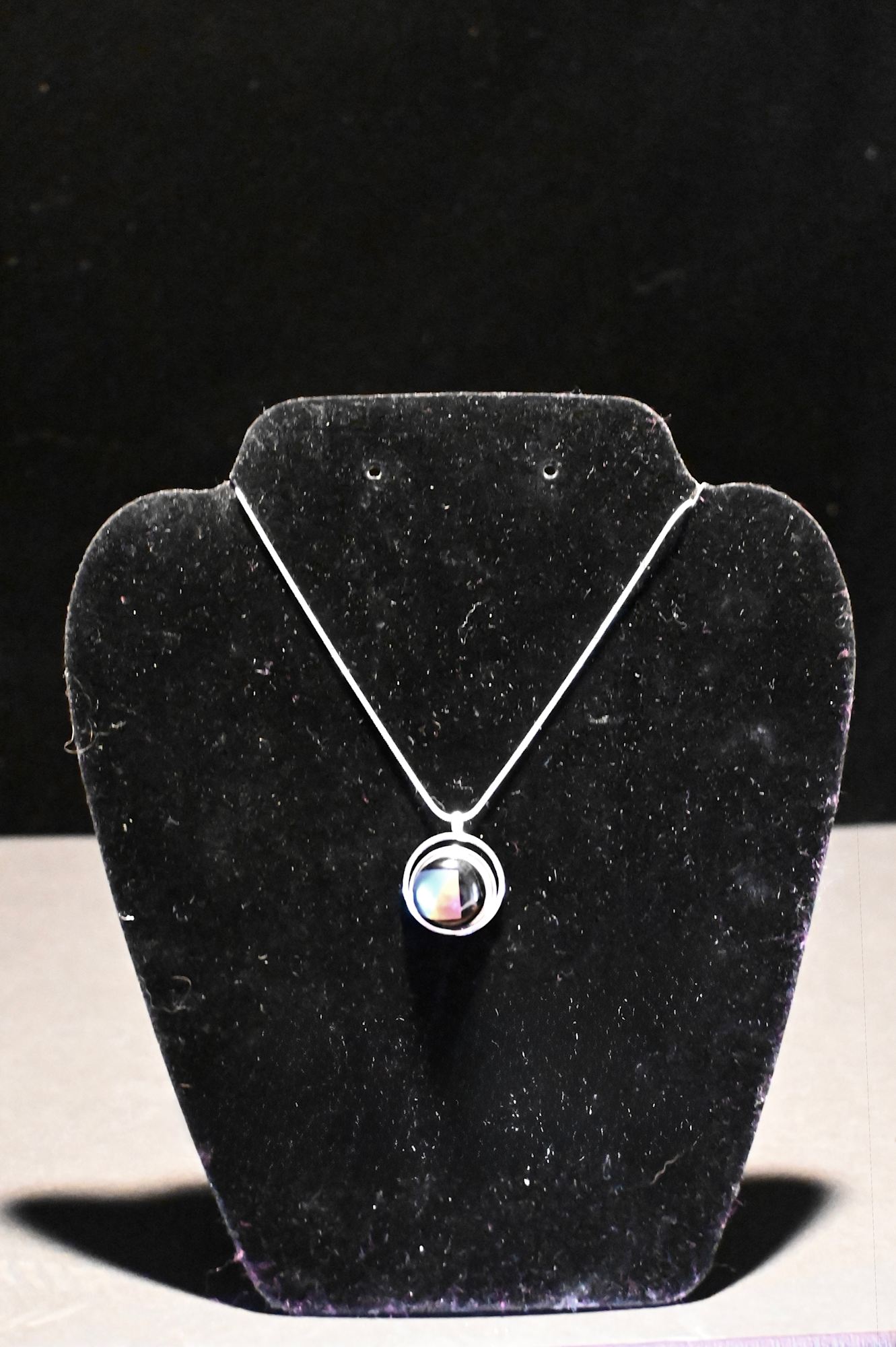 Sterling silver arc within a circle fused glass. 1.5 inch glass cabochon. Offset pearl square on black. 18-inch chain.
