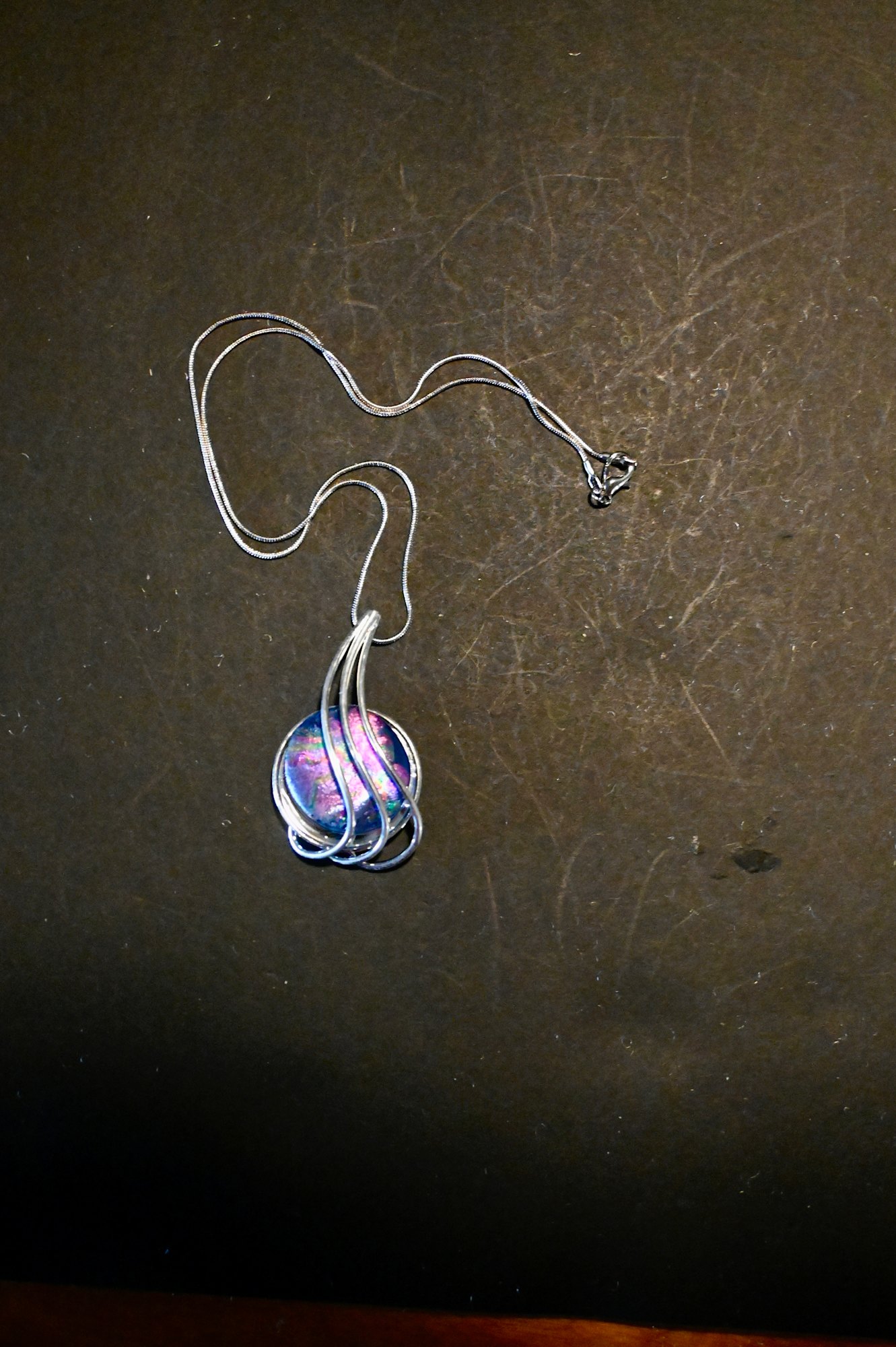 This fused dichroic glass boasts colors of purple, blue, and pewter grey. It is in a lovely sterling silver setting and has an 18-inch sterling silver chain. The cabochon itself measures 2.5 inches.