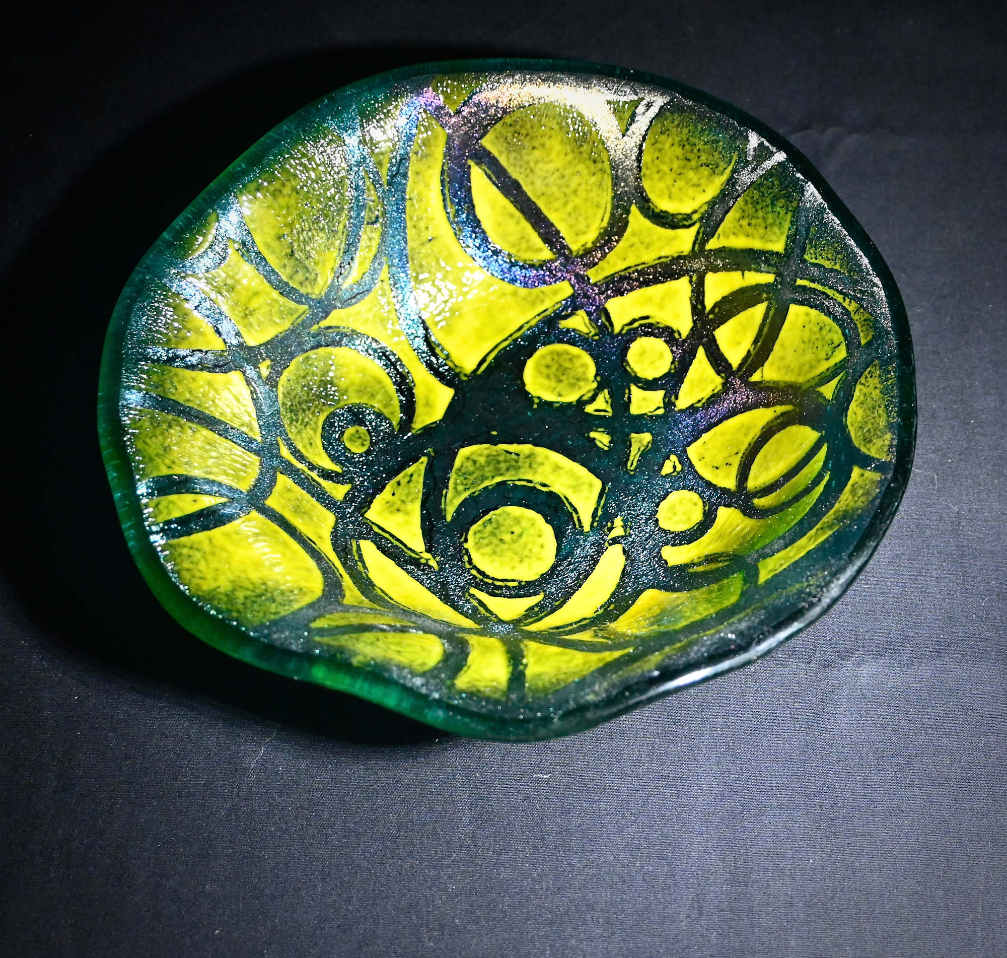 This bowl is made from teal green iridized glass that has a stenciled design made with yellow powdered frit.