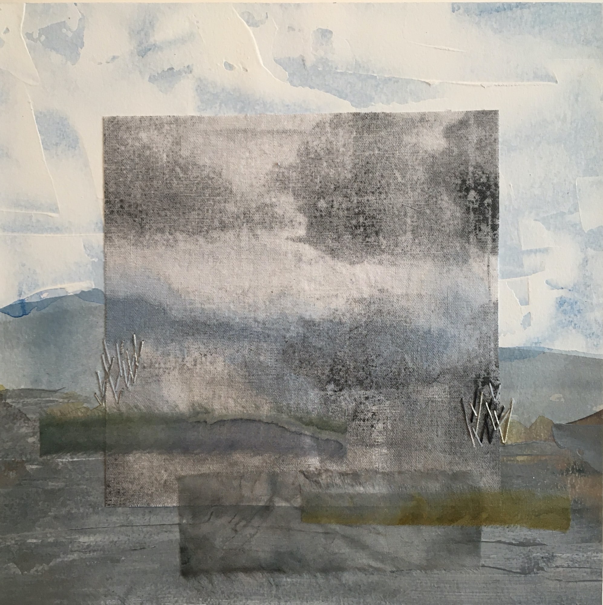 Through the mist of early morning, looking west, towards Salt Spring Island, the largest of the southern Gulf Islands in the Salish Sea. This textile work mounted onto watercolour paper is enhanced with the addition of stitch and silk overlay. It is mounted onto a varnished deep wooden cradle with back wire for hanging.