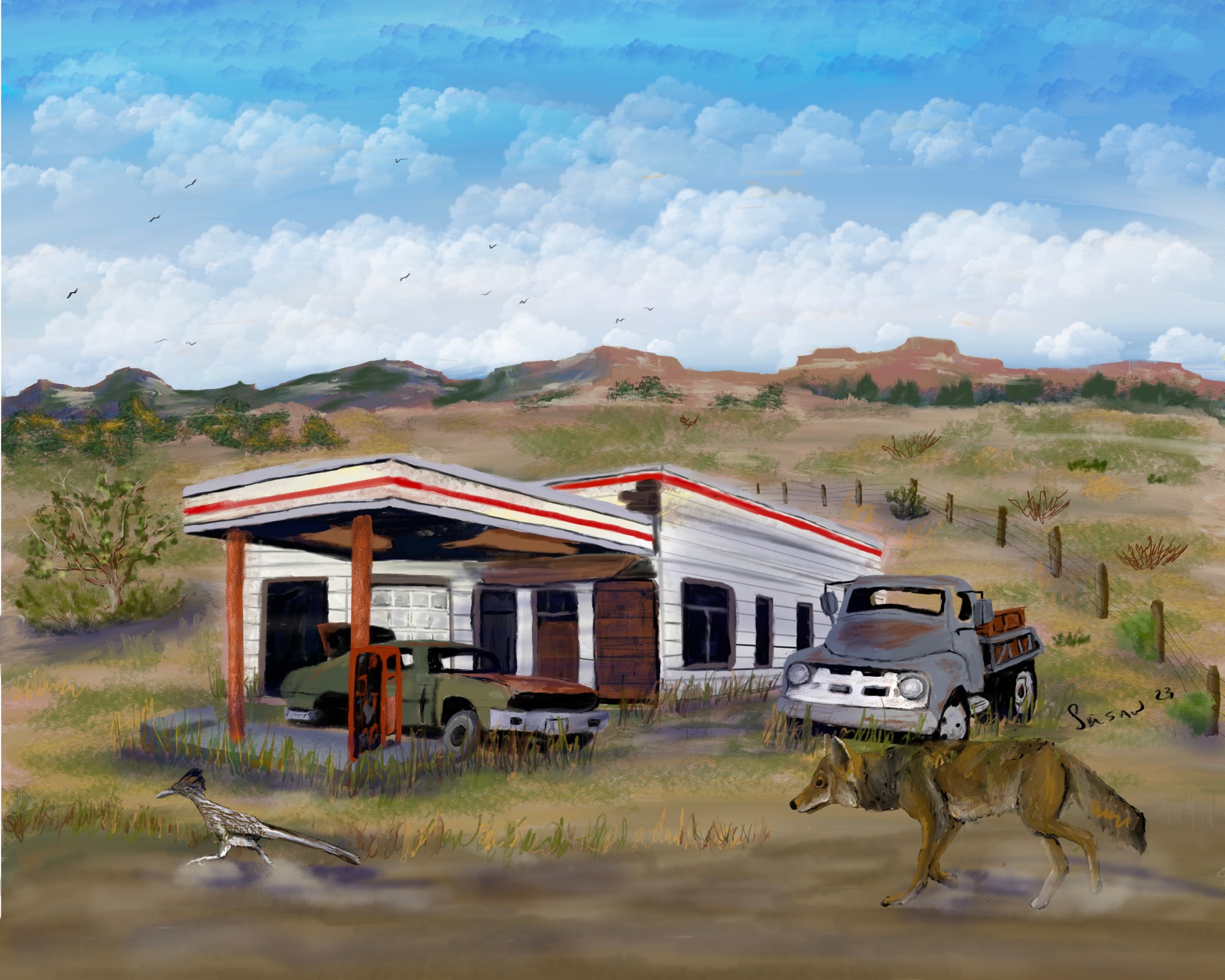 Deserted gas station with roadrunner chased by coyote