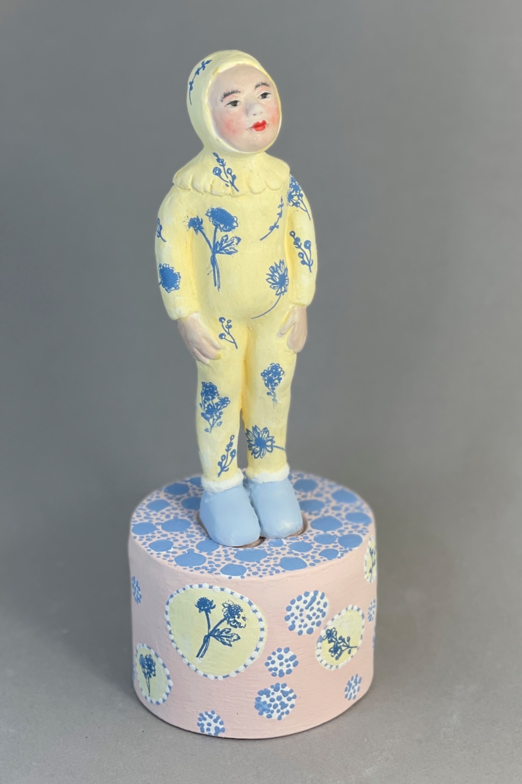 Title: Buttercup - This sculpture combines a bunny outfit with floral accents, evoking a charming blend of nature and childhood. It celebrates the beauty found in simple moments of joy and wonder.